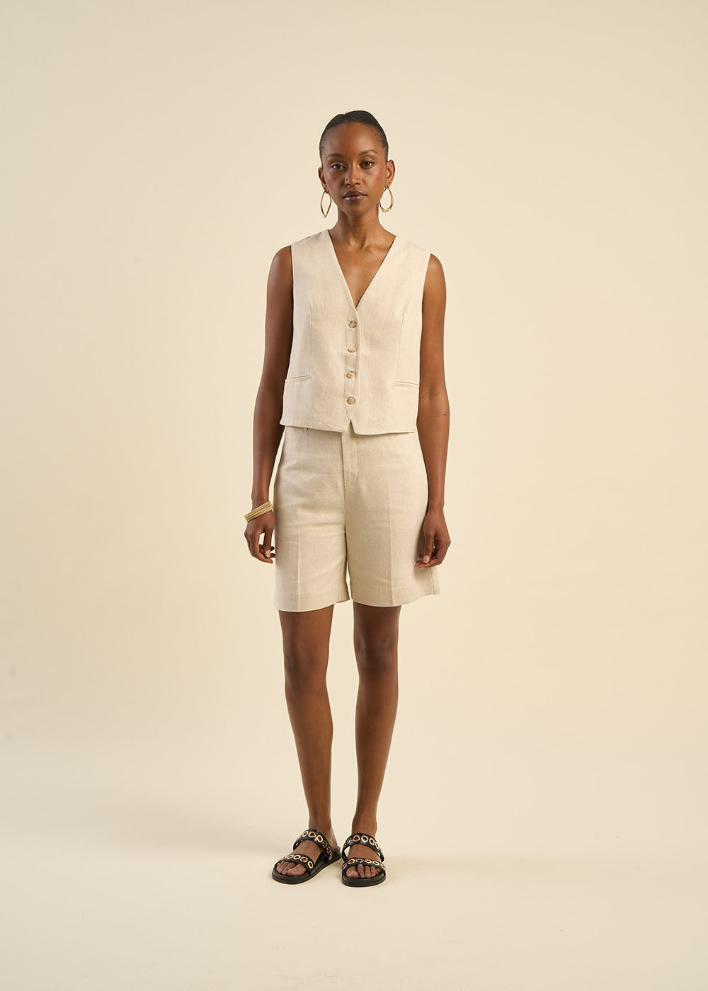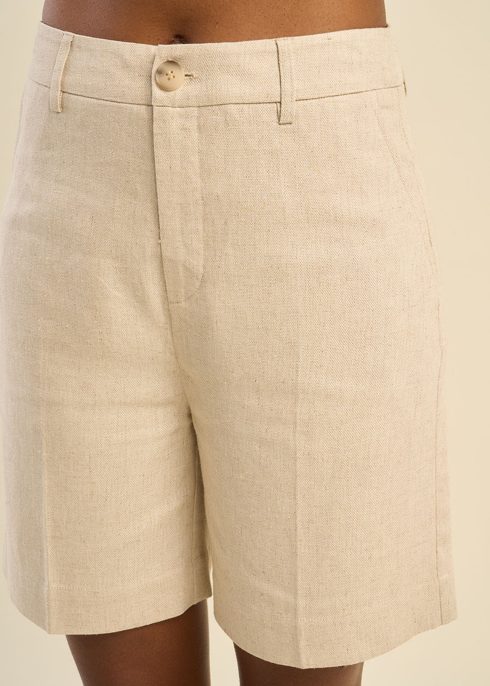 Le bermuda BALINA incarne l’alliance parfaite entre élégance estivale et confort au quotidien. Grâce à sa coupe structurée à pinces et sa matière légère, il s’impose comme un essentiel du vestiaire habillé pour les beaux jours.