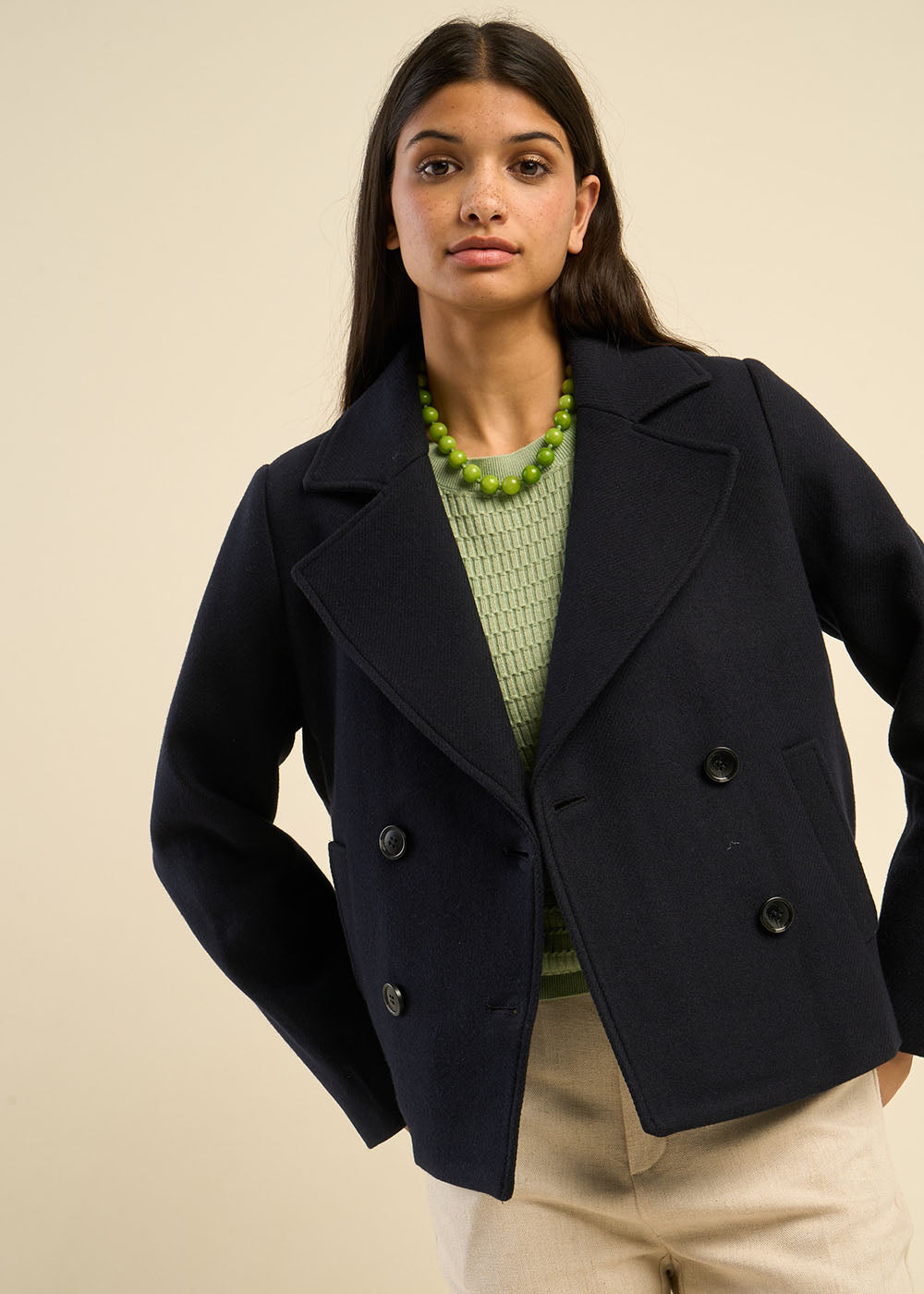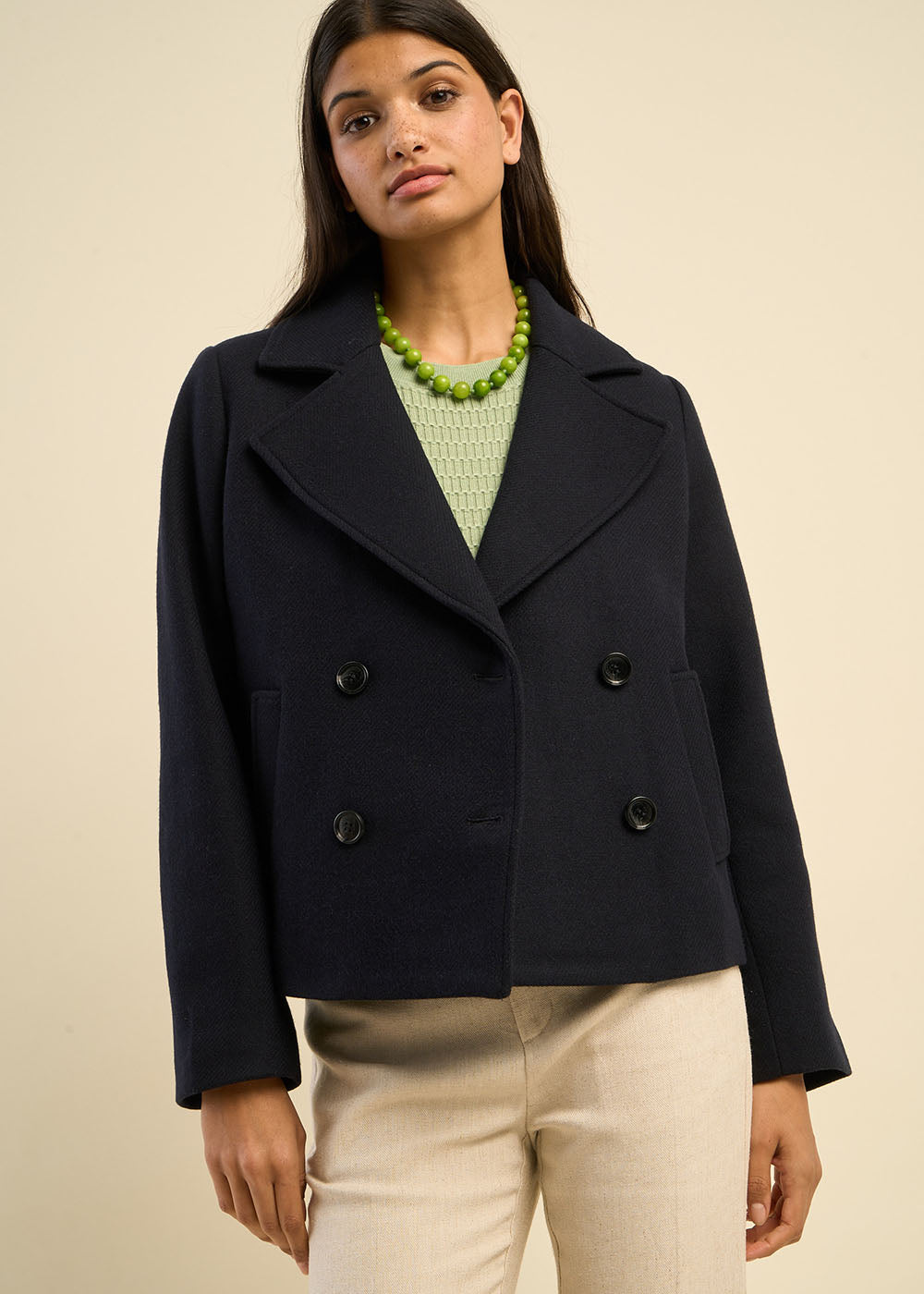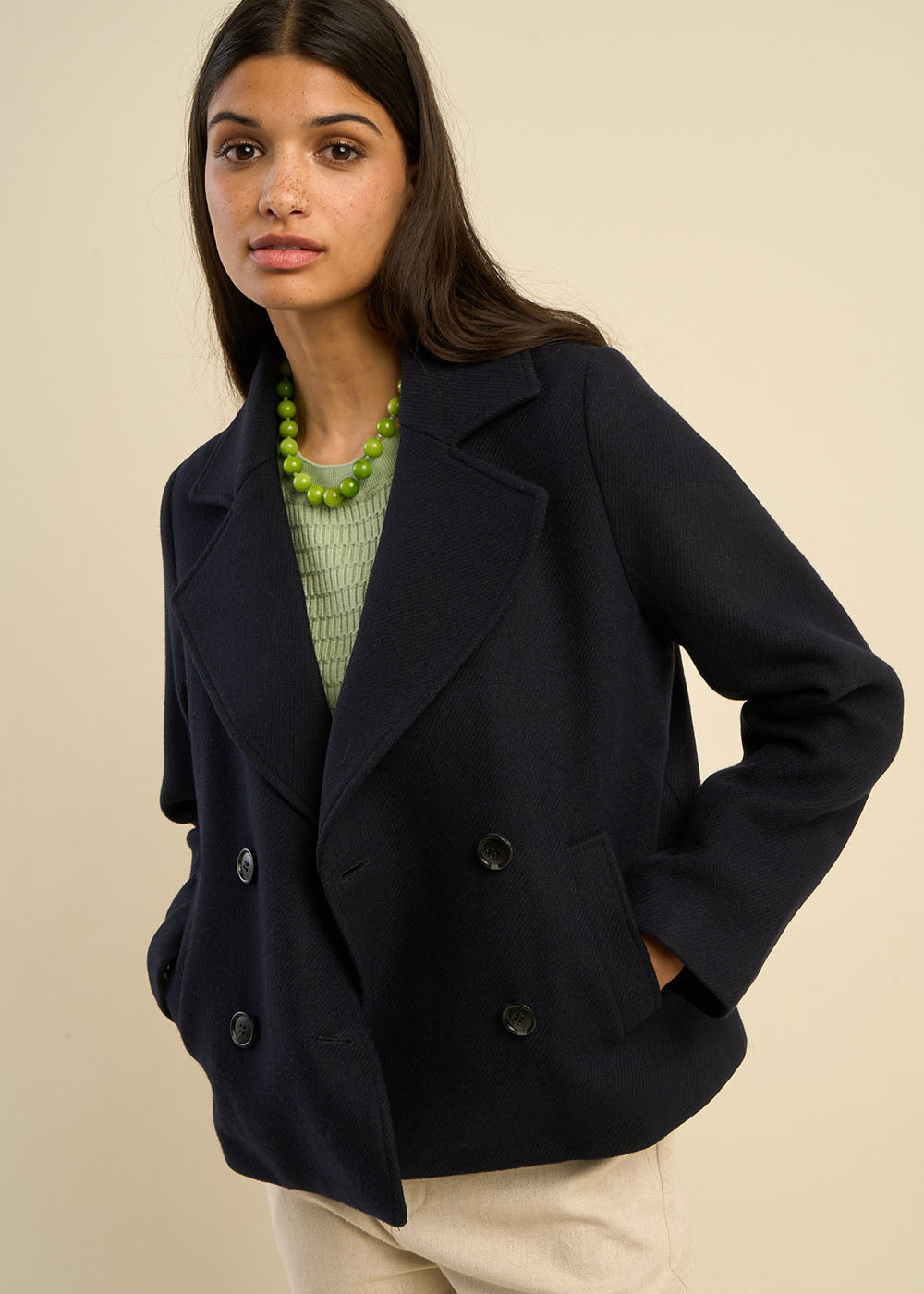 Le manteau MAXY est l'essence même du chic et du raffinement. Ce caban court en drap de laine séduit par son design élégant et ses détails sophistiqués. Avec son col tailleur classique et son double boutonnage croisé, il incarne une allure intemporelle. Les deux poches raglan discrètes ajoutent une touche pratique tout en préservant la fluidité du design. Idéal pour rehausser vos tenues d'hiver, le manteau MAXY allie style et confort pour un look impeccable.