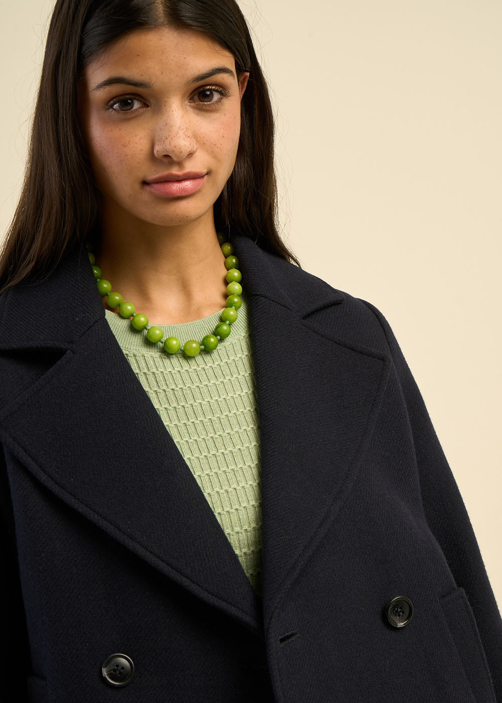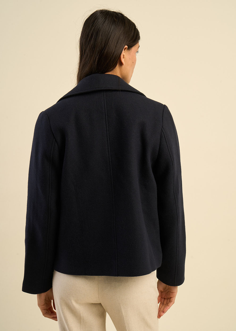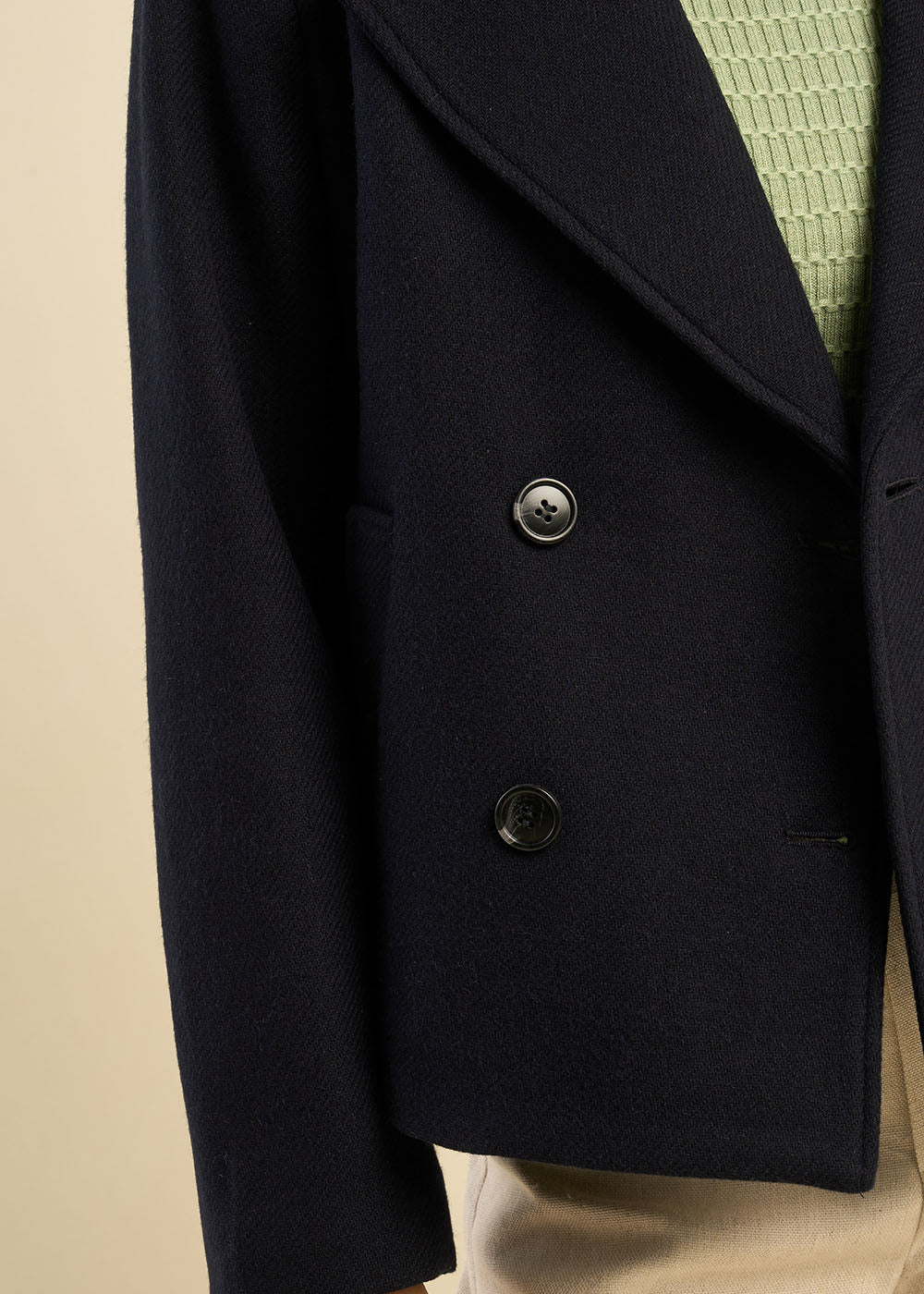 Le manteau MAXY est l'essence même du chic et du raffinement. Ce caban court en drap de laine séduit par son design élégant et ses détails sophistiqués. Avec son col tailleur classique et son double boutonnage croisé, il incarne une allure intemporelle. Les deux poches raglan discrètes ajoutent une touche pratique tout en préservant la fluidité du design. Idéal pour rehausser vos tenues d'hiver, le manteau MAXY allie style et confort pour un look impeccable.