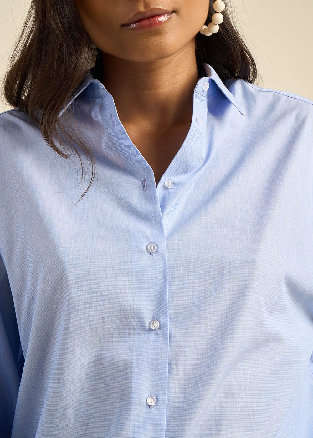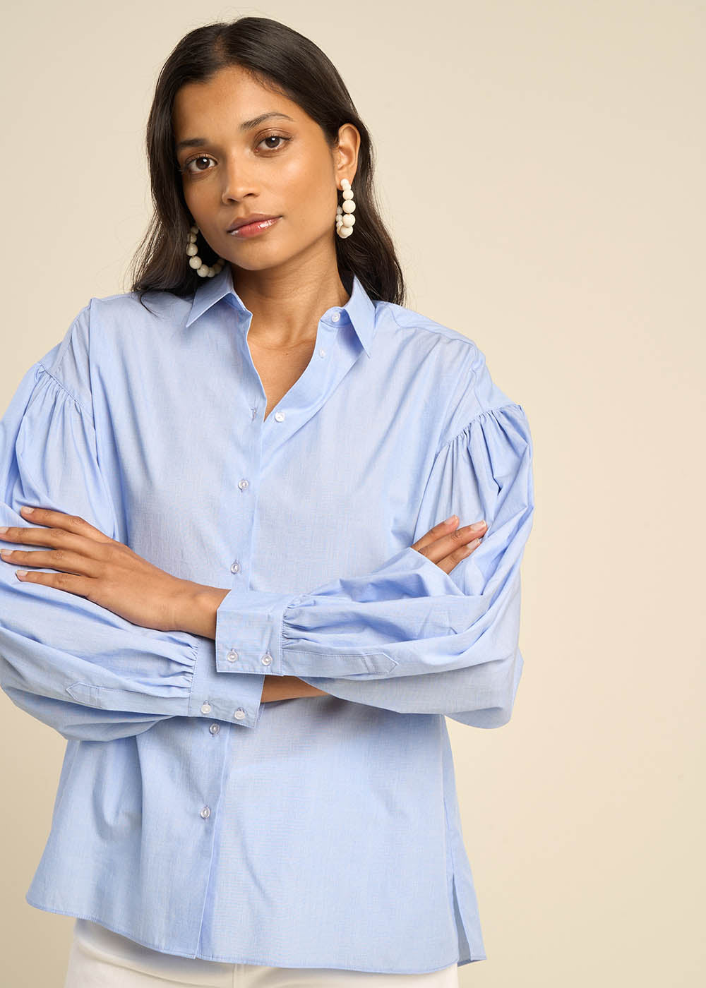 La chemise CATALINA en fils à fils bleu ciel est un éloge à l'élégance décontractée. Son col classique et ses manches longues bouffantes avec poignets ajoutent une touche de sophistication. Les découpes aux épaules et l'empiècement au dos créent une silhouette ample et volumineuse. Parfaite avec un jean écru ou medium stone, elle incarne le mariage idéal du chic et du confort.