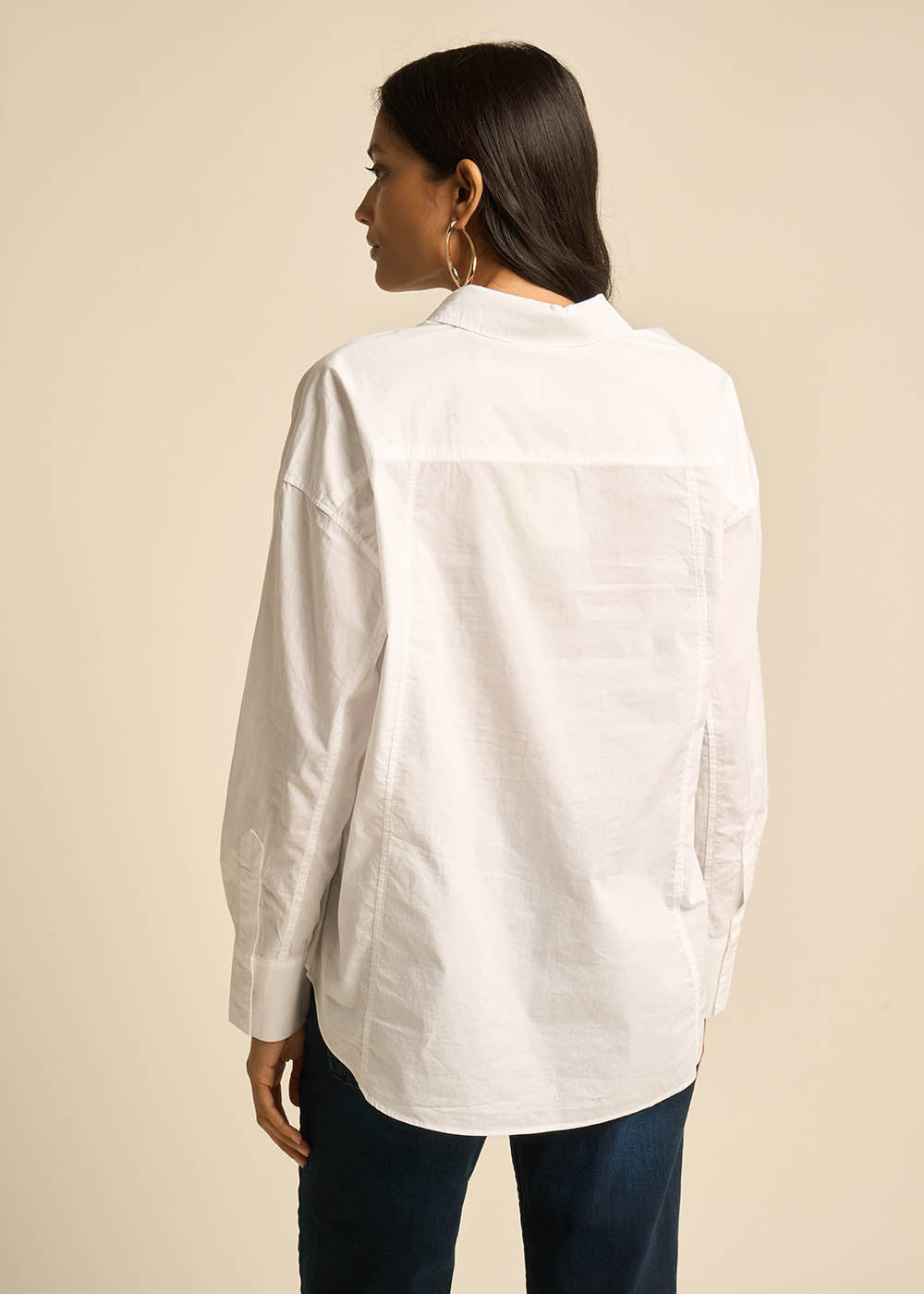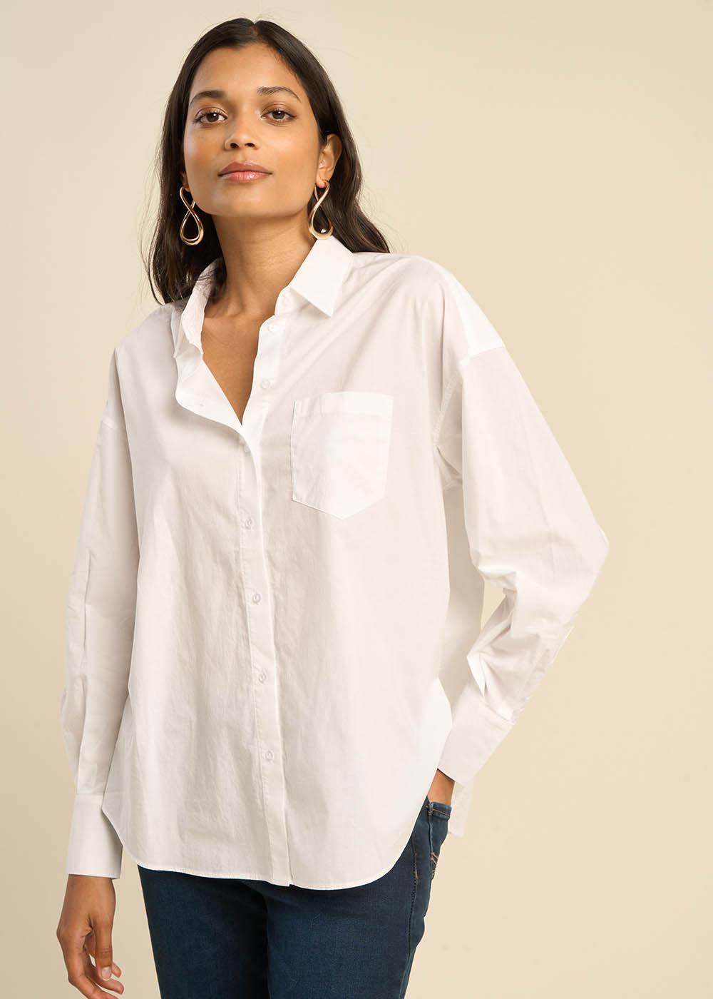 La chemise blanche CELISE a une coupe oversize. Cette chemise en 100% Coton est un basique incontournable pour une garde-robe moderne. Elle présente une poche poitrine et des manches tombantes, alliant confort et style pour un look décontracté chic.