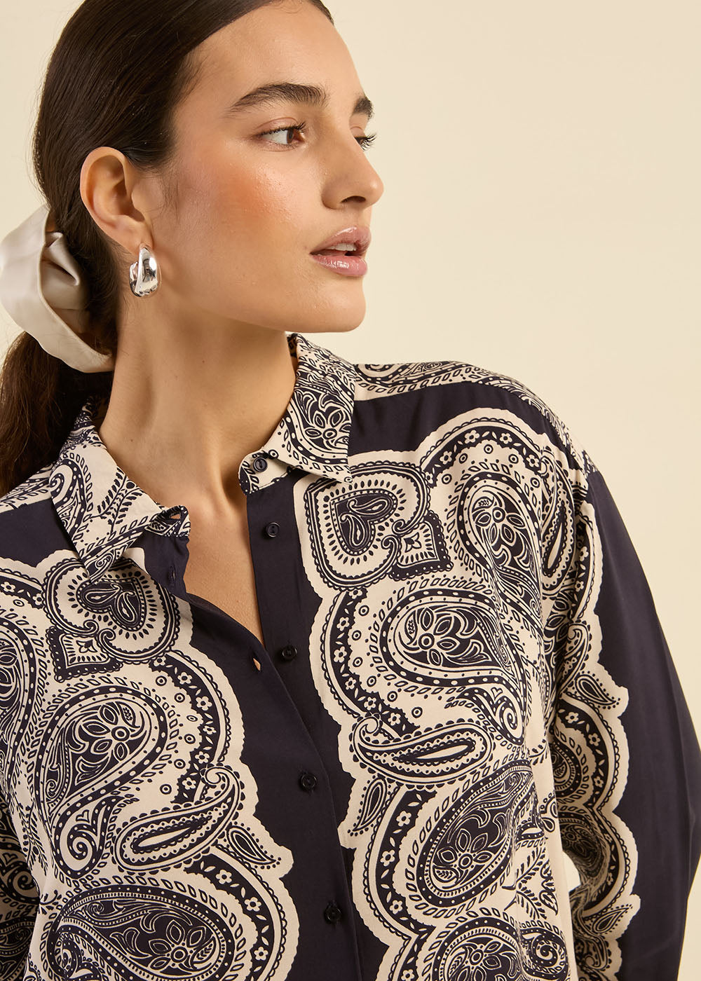 La chemise CANAKA séduit par son imprimé cachemire audacieux et sa coupe oversize, parfaite pour un look tendance. Confectionnée dans un tissu fluide, elle arbore un col classique, une patte de boutonnage centrale et des manches longues avec poignets boutonnés. Sa forme liquette arrondie apporte une touche féminine et moderne. Portez-la avec un pantalon en cuir pour une allure sophistiquée ou un jean droit pour un style casual chic.
