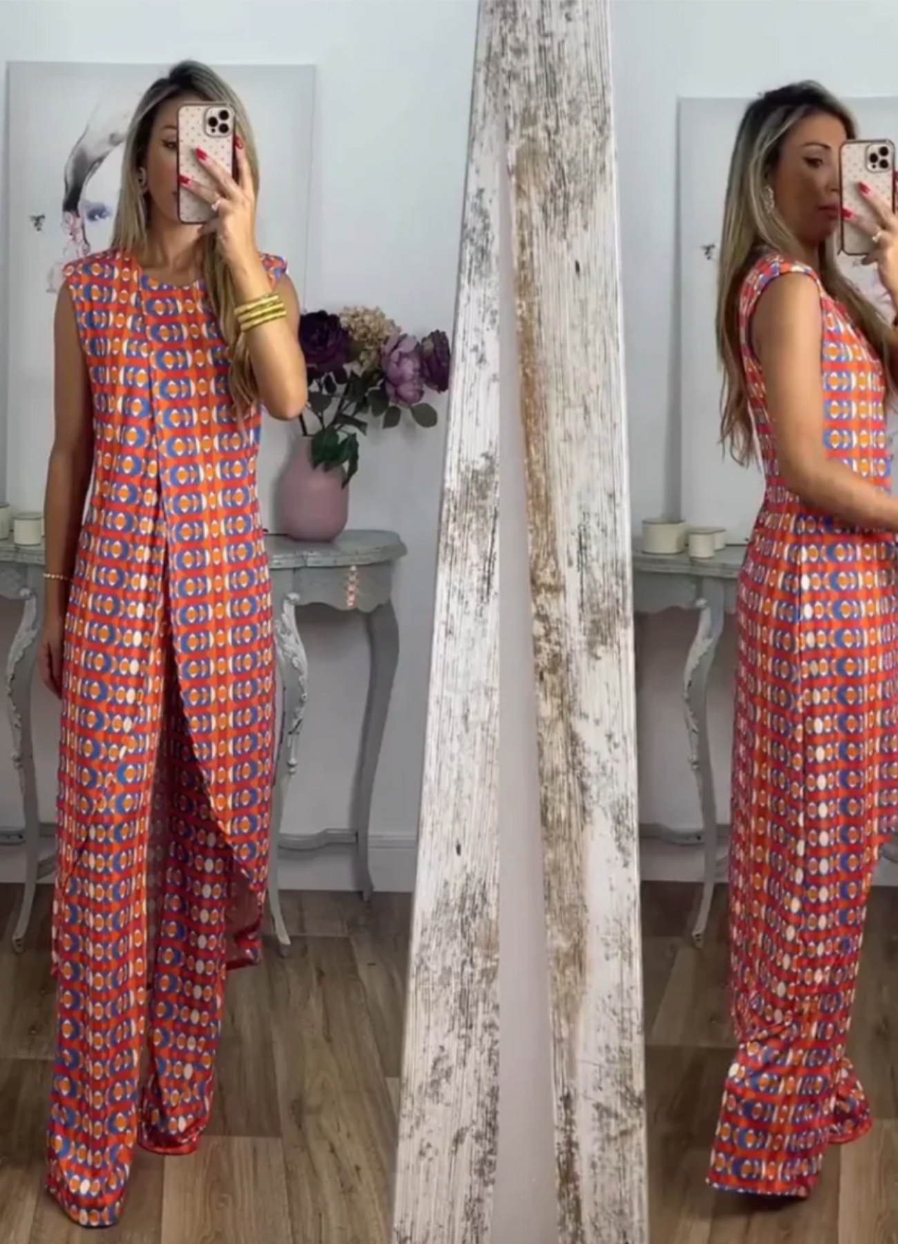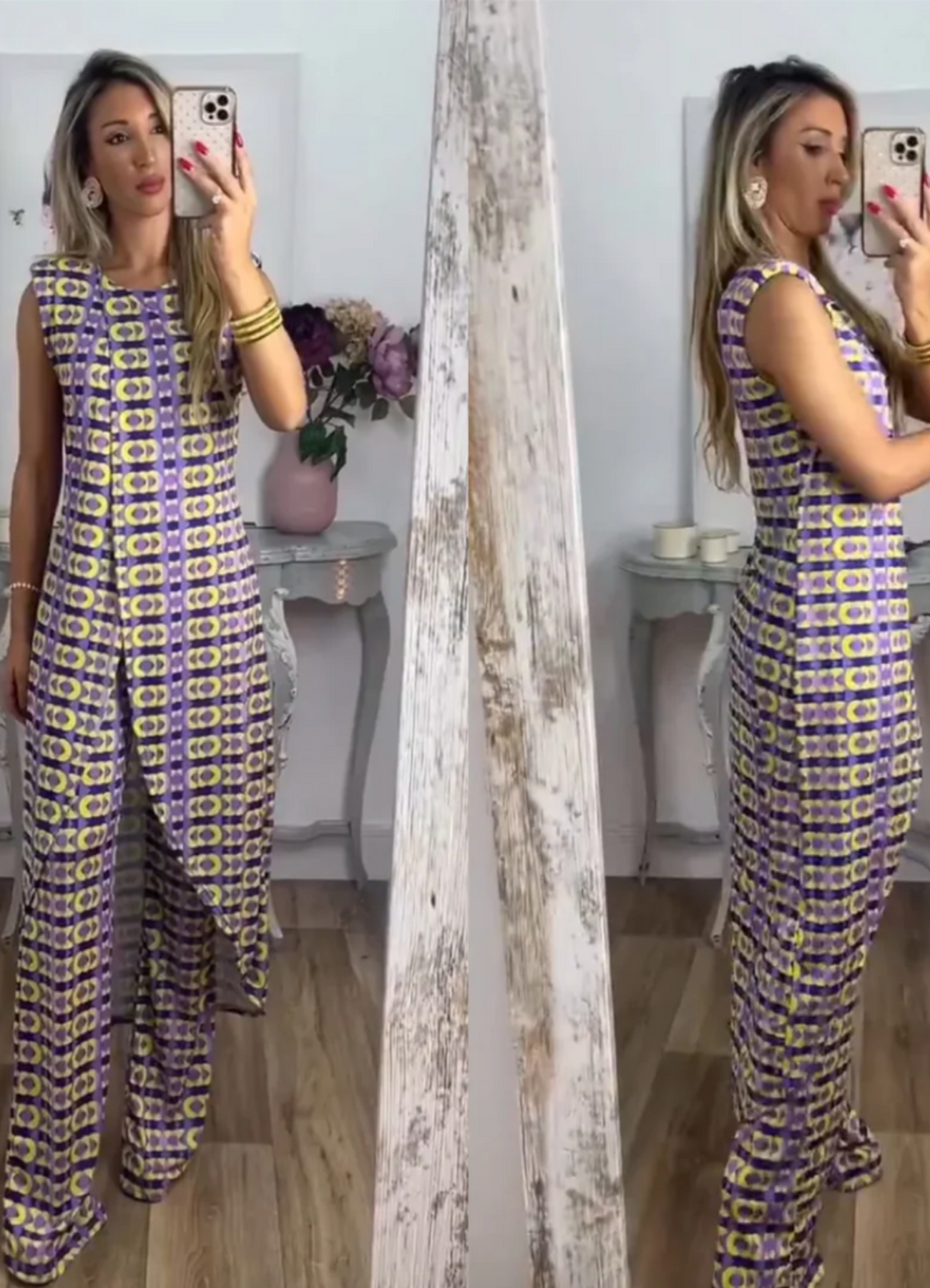 - Design moderne : Le motif géométrique et la coupe fluide créent un look stylé et contemporain, parfait pour des occasions décontractées.