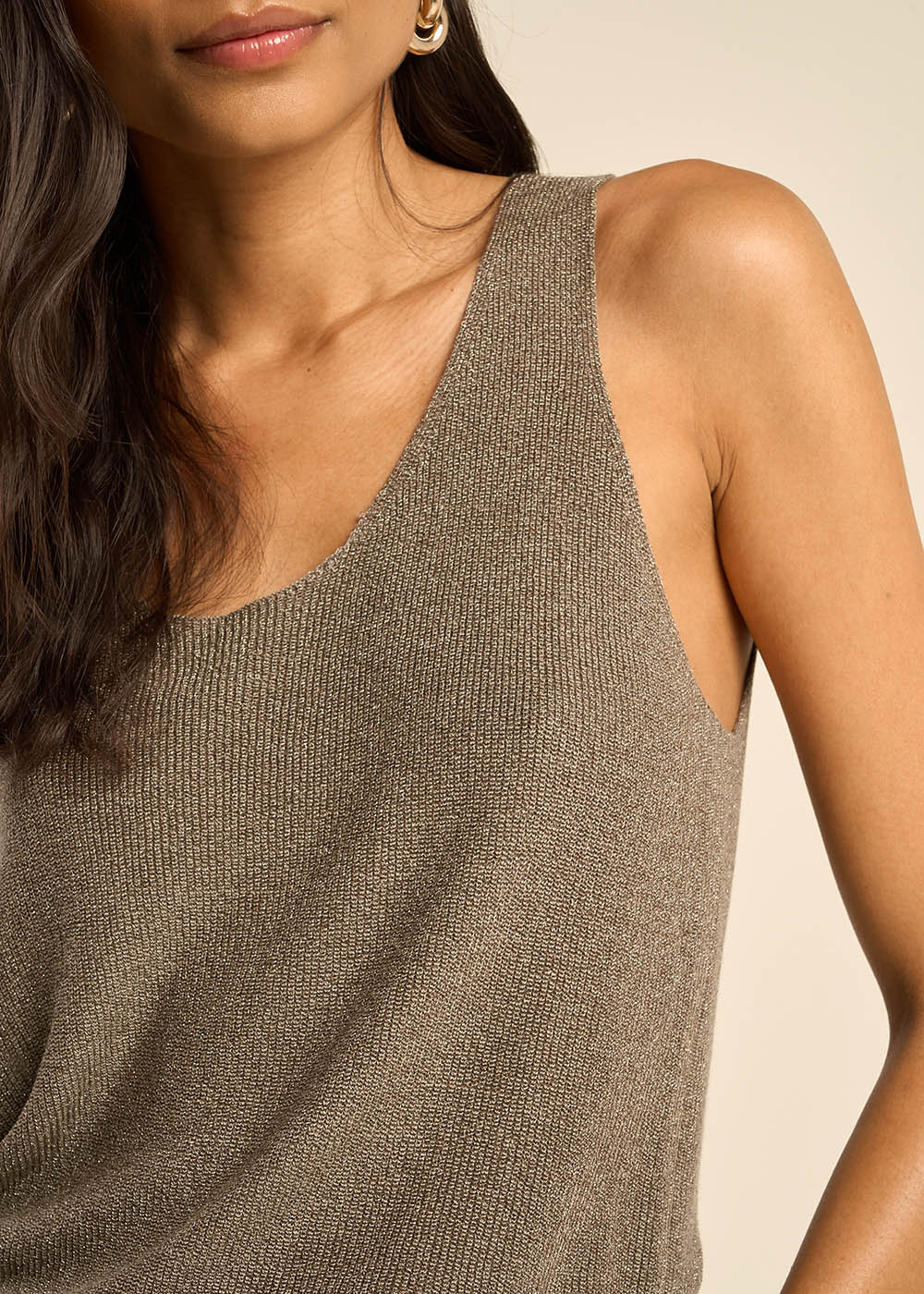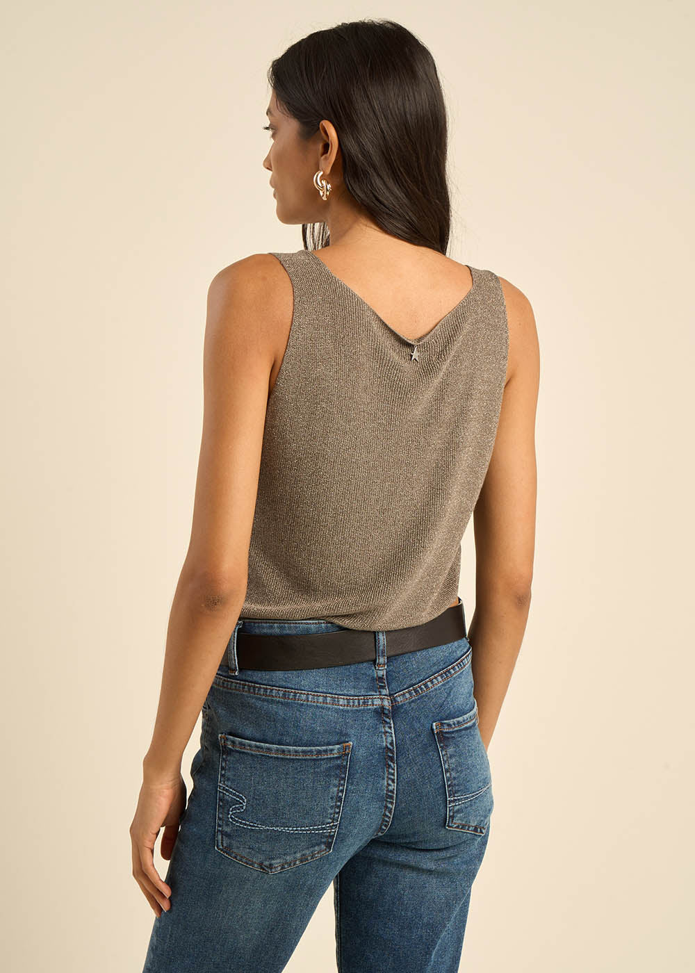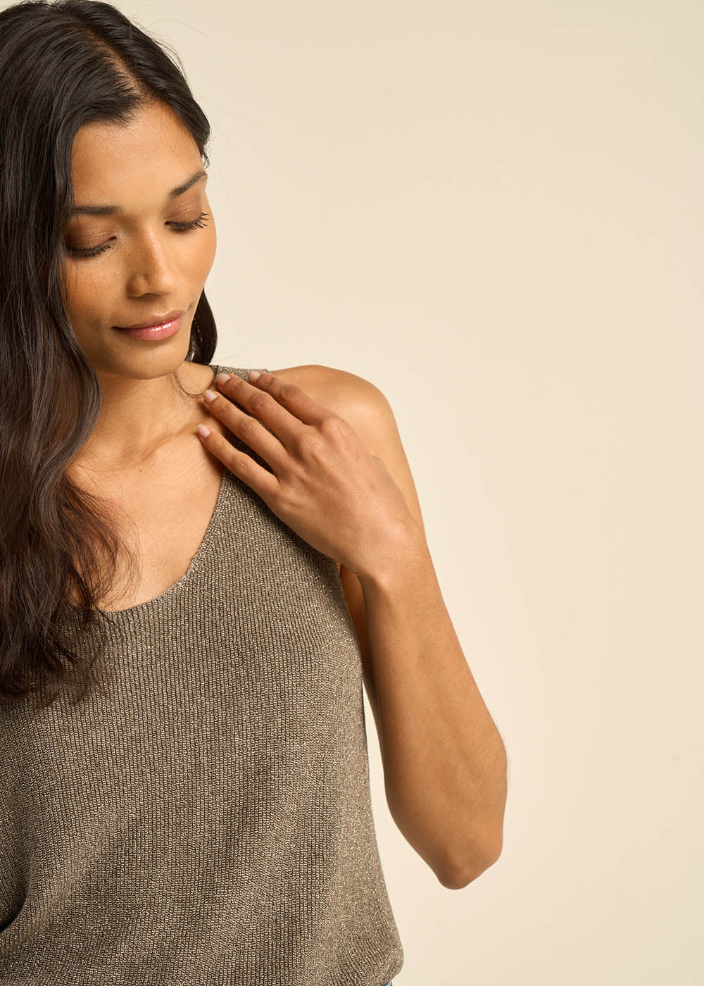 Le DIBA est un débardeur à encolure ronde fabriqué dans une maille scintillante grâce à l'utilisation de fibres métallisées. Avec une coupe moderne et ample il est adapté aussi bien pour des tenues décontractées que pour des looks plus chics