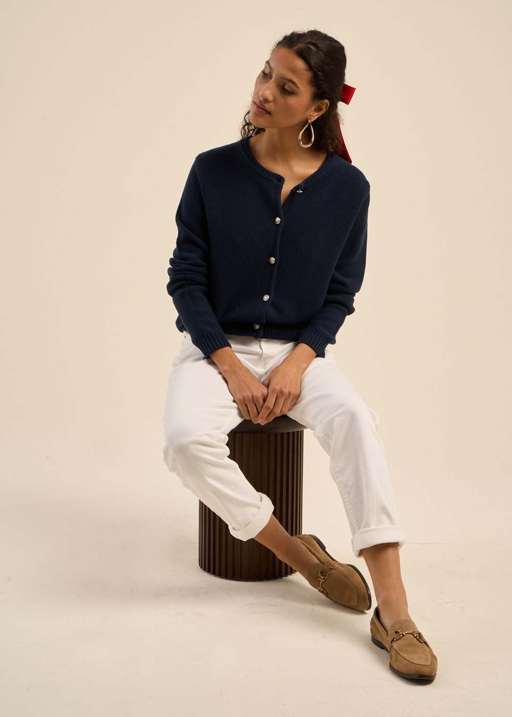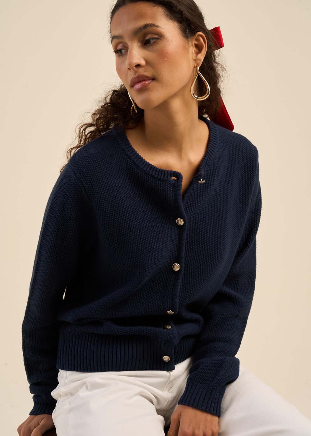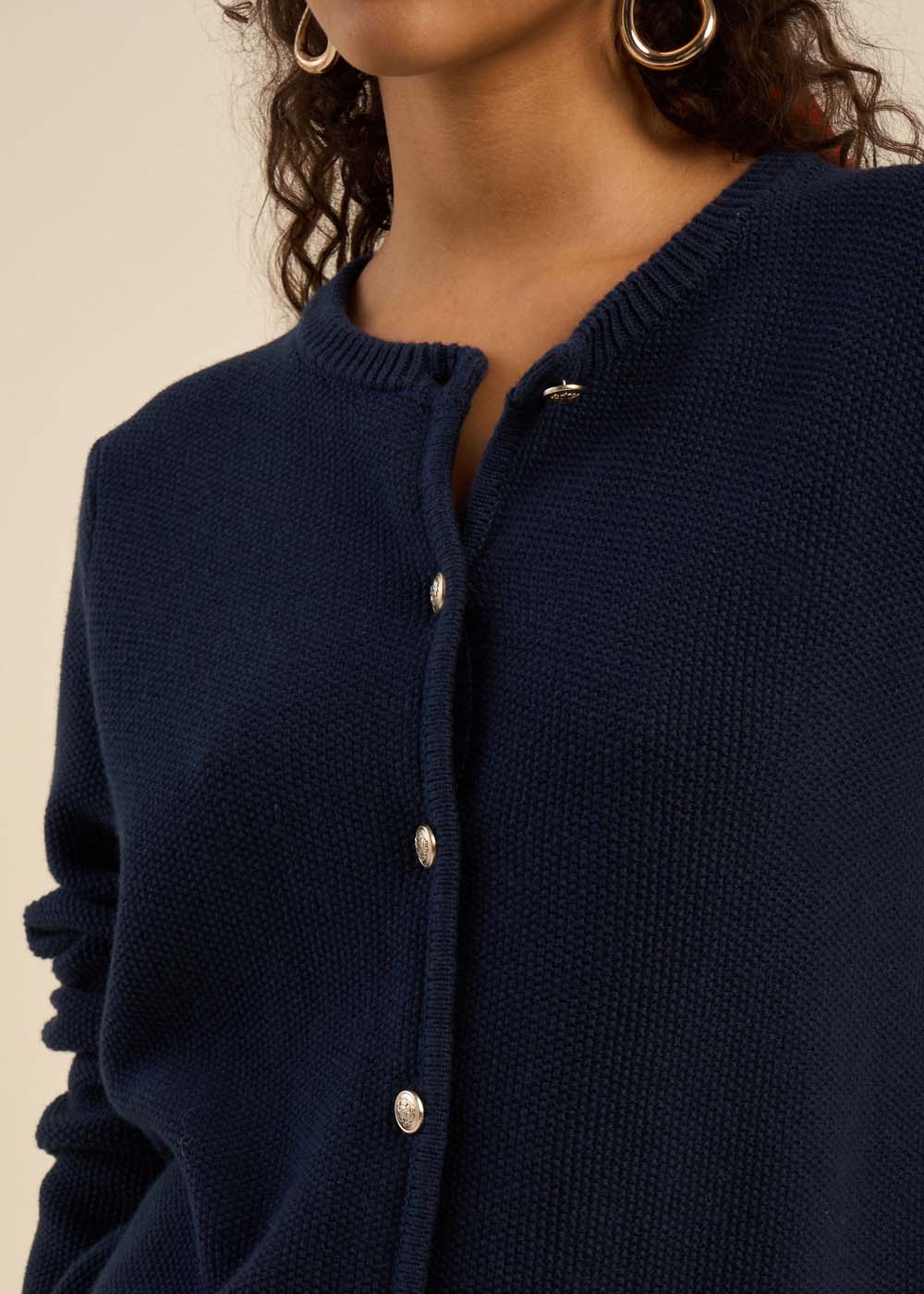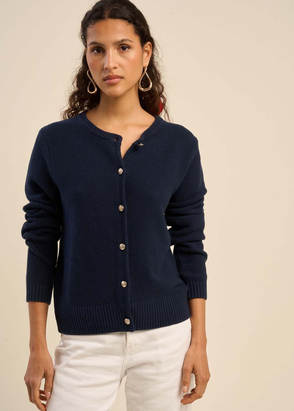 Le GLORIA est un gilet court et ajusté qui sublime la silhouette avec élégance. Conçu avec un col rond et un tricot en point mousse, il se distingue par ses boutons bijoux dorés qui ajoutent une note de raffinement. Les bords-côtes assurent une finition parfaite, tandis que le mélange de coton et de laine offre douceur et confort.