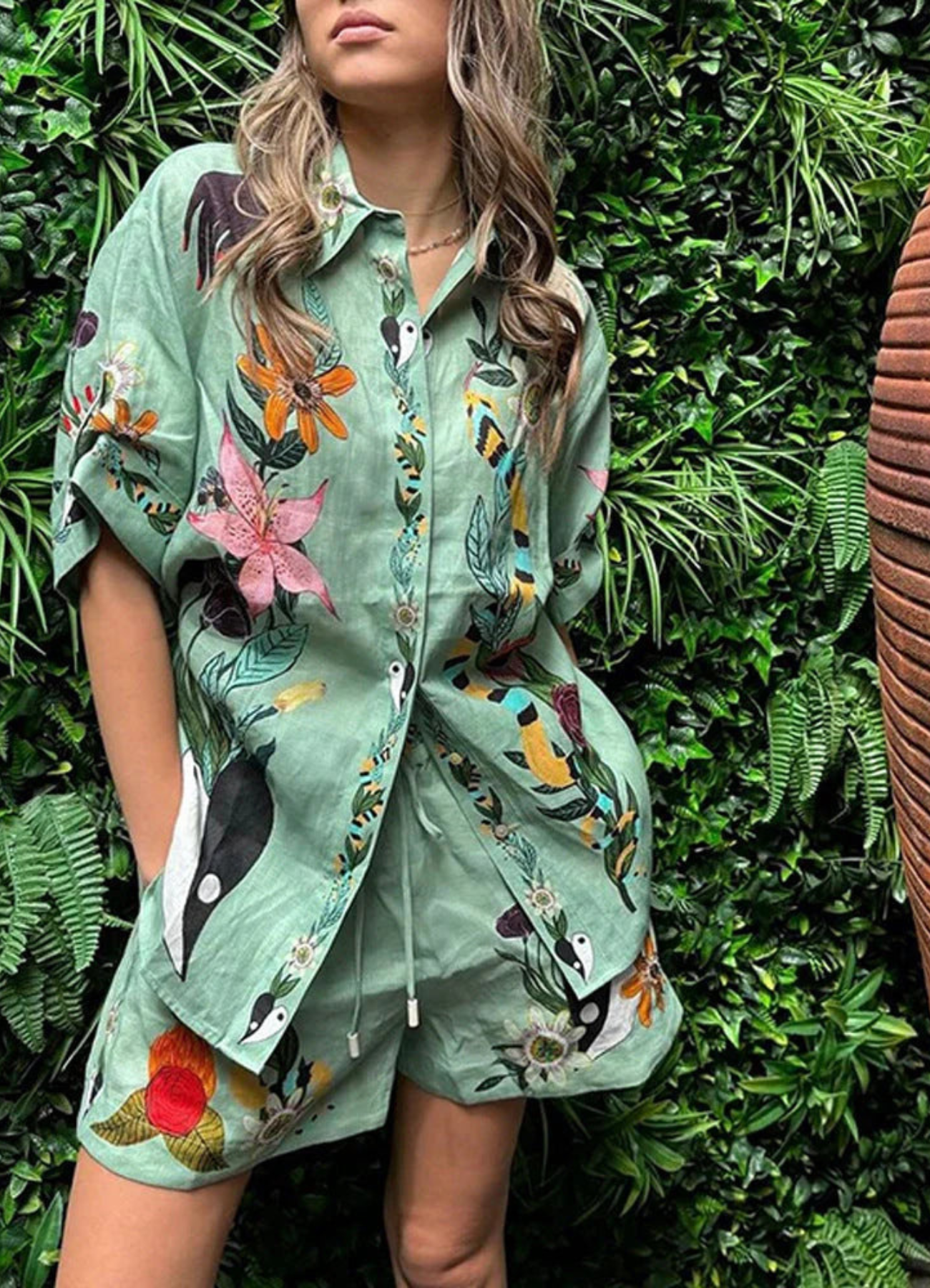 Ce set tropical composé d'une chemise à boutons et de shorts à taille élastique est idéal pour les journées estivales. Avec son imprimé vibrant de toucans et de fleurs, il apporte une touche colorée et joyeuse à vos tenues. Son design décontracté vous assure confort et style pour les sorties à la plage, les vacances ou les promenades sous le soleil.