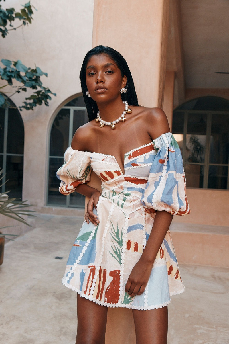Avec son imprimé vibrant et artistique, cette robe présente un design à épaules dénudées qui accentue le décolleté et les clavicules, ajoutant une note de sophistication. Les manches bouffantes volumineuses équilibrent la taille ajustée, créant une silhouette flatteuse. Sa longueur mini ludique en fait un choix parfait pour les sorties de jour comme pour les événements en soirée.