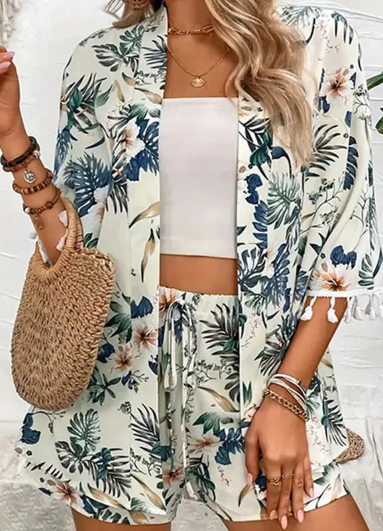 Ce set estival se compose d’un haut kimono ouvert et de shorts à taille ajustable, parfaits pour les journées ensoleillées et les escapades à la plage. Arborant un motif botanique luxuriant avec des palmiers , des fleurs et des touches délicates, il apporte fraîcheur et style à votre garde-robe.