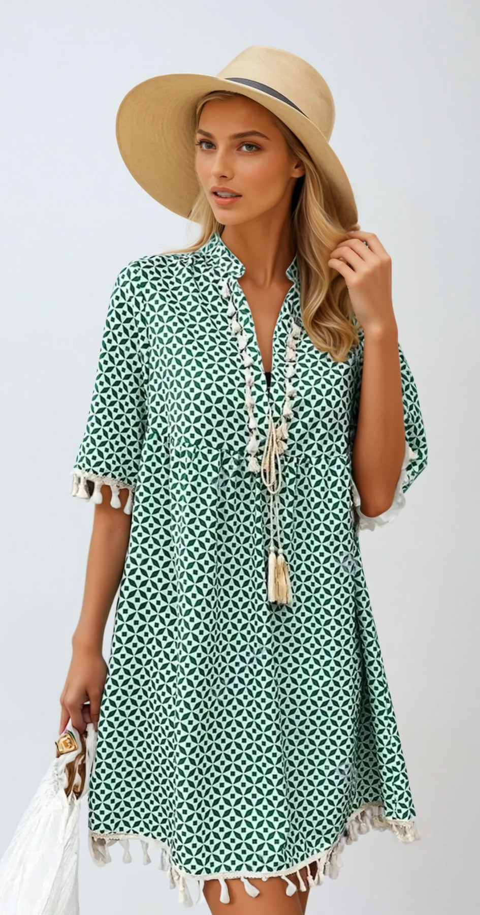 Exprimez votre style avec naturel grâce à Léa, la robe mini bohème à imprimé vibrant et finitions à pompons. Conçue pour celles qui aiment allier confort et originalité, Léa séduit par sa coupe fluide, ses détails ludiques et son tissu léger. Parfaite pour une journée ensoleillée, une sortie à la plage ou un brunch détendu, elle incarne la liberté estivale dans toute sa splendeur.