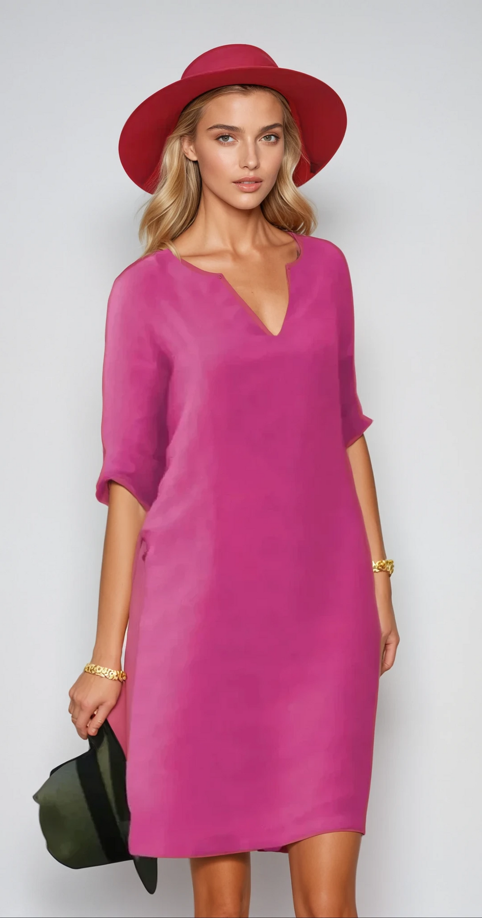 Lina est confectionnée dans un tissu doux et respirant, idéal pour les températures estivales. Sa texture fluide épouse délicatement le corps sans alourdir la tenue.