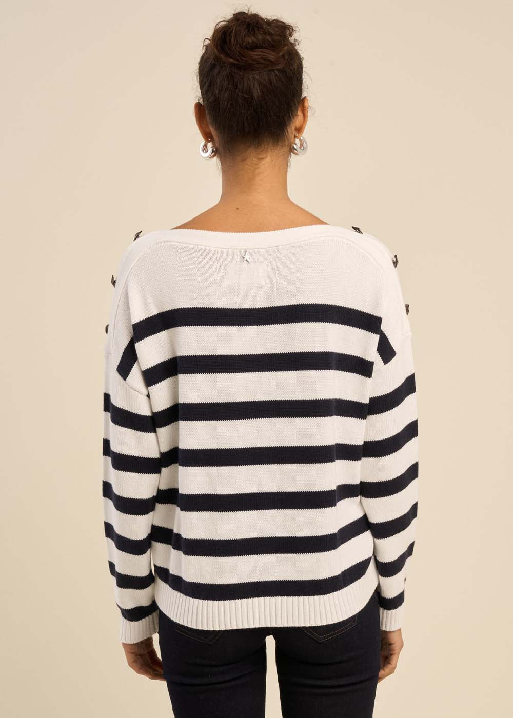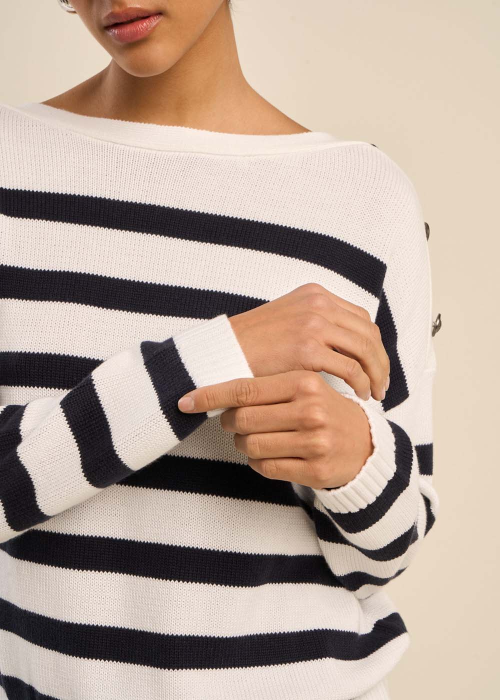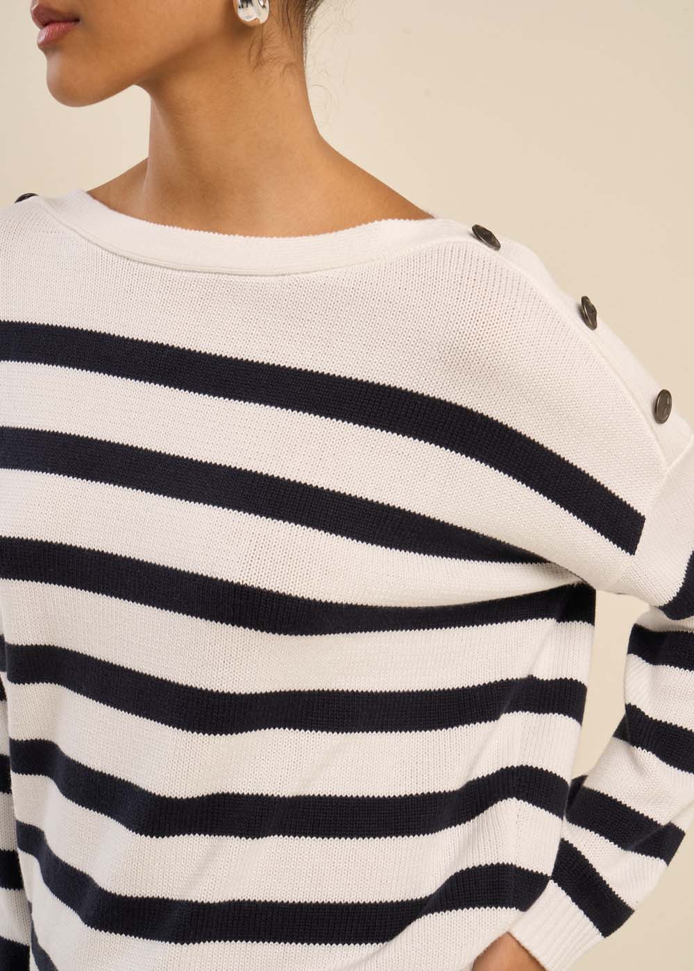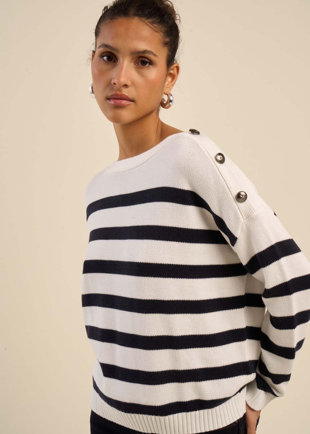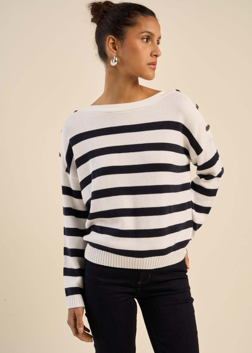 Le pull MEDYA réinvente la marinière avec une touche de modernité et de confort. Sa coupe ample et son col bateau vous apportent une allure décontractée et élégante, tandis que les épaules tombantes ajoutent une note contemporaine. Les fausses pattes de boutonnage à l’épaule, avec leurs boutons décoratifs, apportent une touche originale et unique. Fabriqué dans une matière douce, ce pull vous offre bien-être et style au quotidien. Parfait pour un look simple mais raffiné !