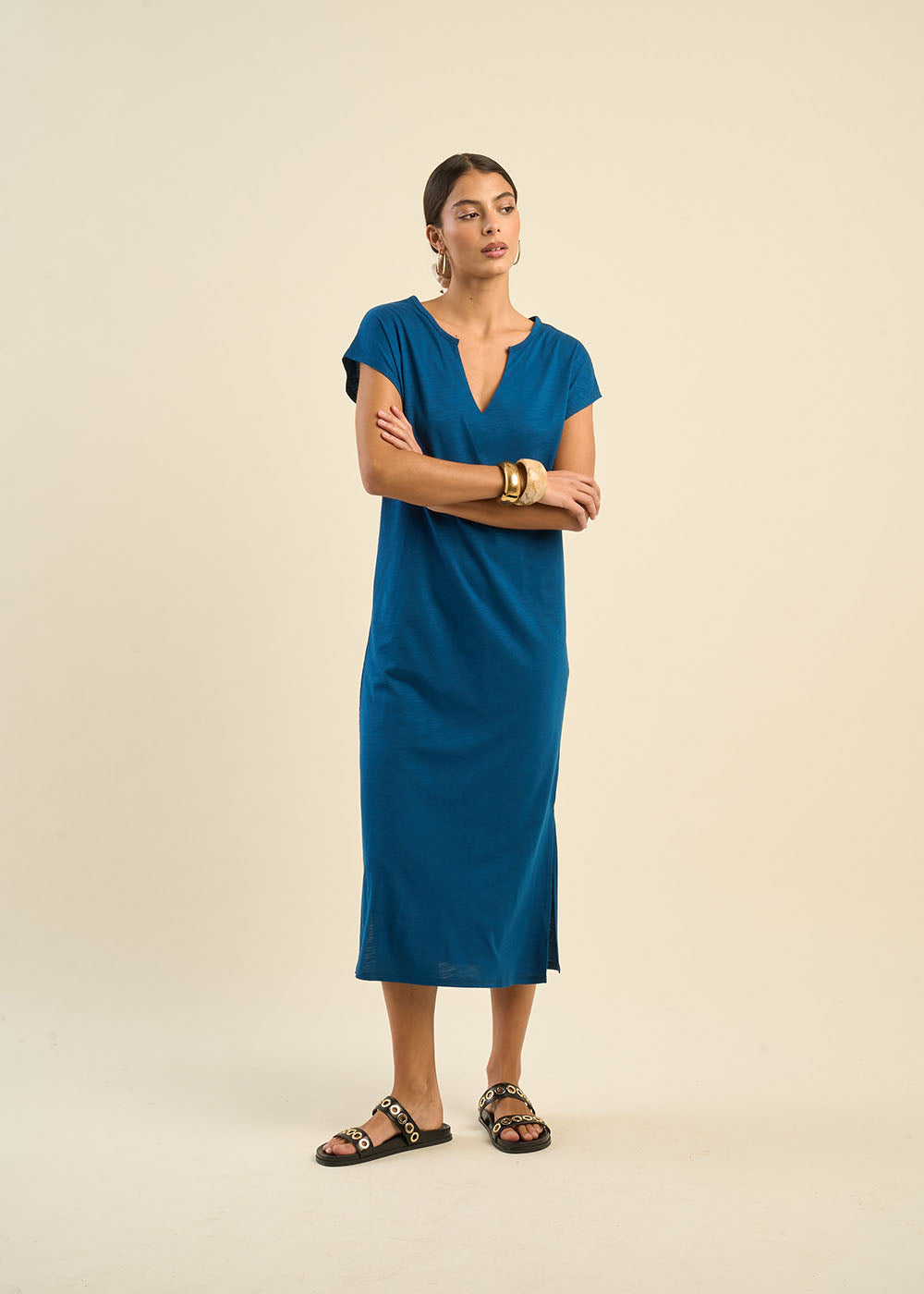 La robe midi ROCYLA incarne l’élégance minimaliste avec sa coupe droite et son design épuré. Confectionnée en coton modal slub, elle se distingue par sa texture légèrement flammée, apportant une touche naturelle et sophistiquée. Son col tunisien ajoute une note authentique, tandis que sa fente sur le côté offre une liberté de mouvement subtile. Sans manches, elle est idéale pour les journées estivales, garantissant confort et légèreté. Son mélange de coton et de modal assure une respirabilité optimale, une douceur durable et une excellente résistance, faisant de cette robe un basique incontournable de la garde-robe d’été.