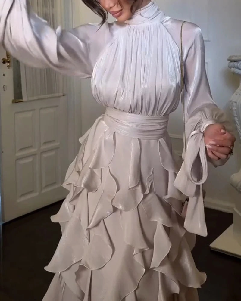 Apportez une touche de raffinement à votre garde-robe avec cette robe élégante à col haut et volants. Sa coupe flatteuse met en valeur la silhouette tout en offrant un confort aérien. Parfaite pour les occasions spéciales ou les soirées d’été.