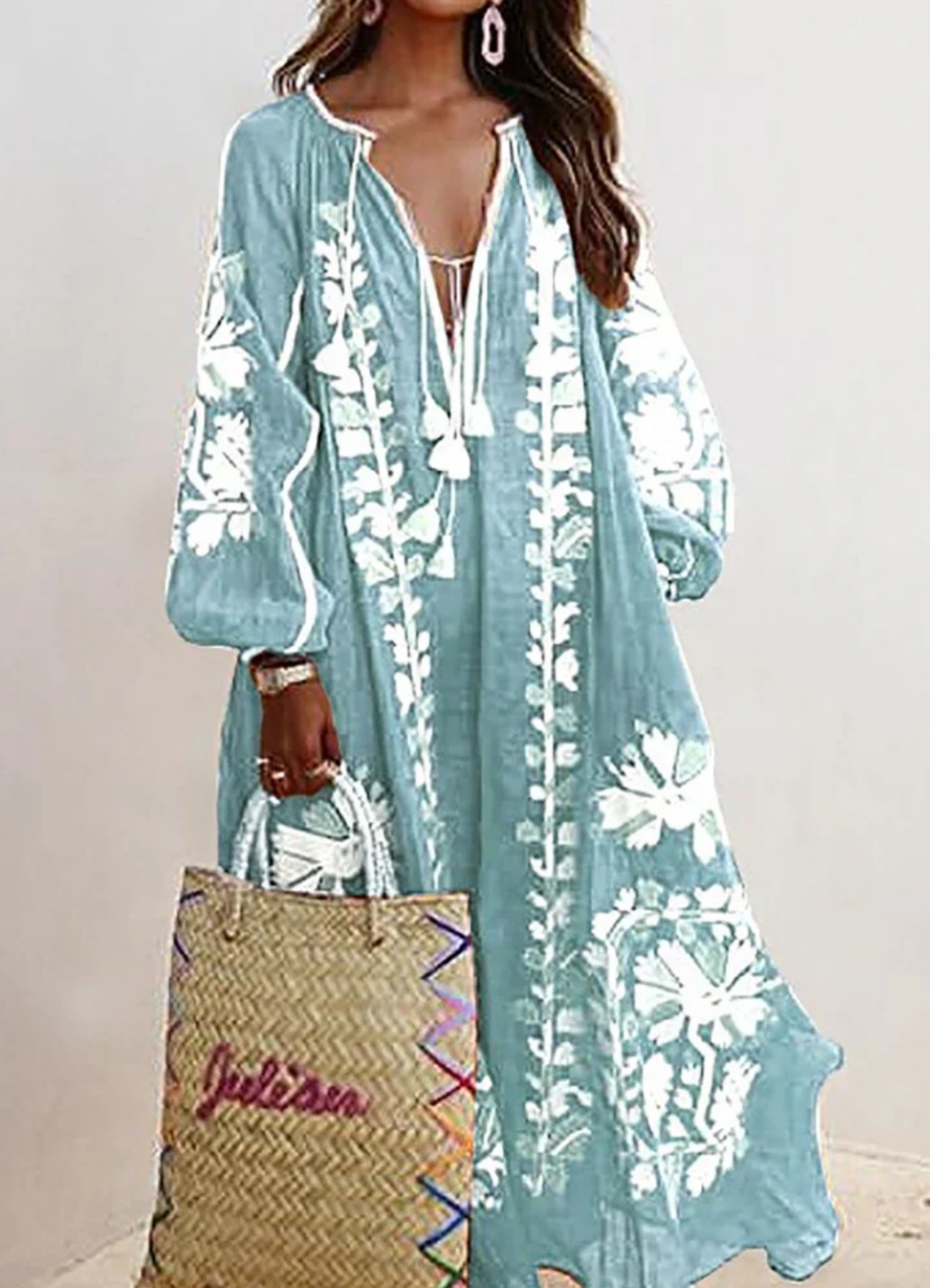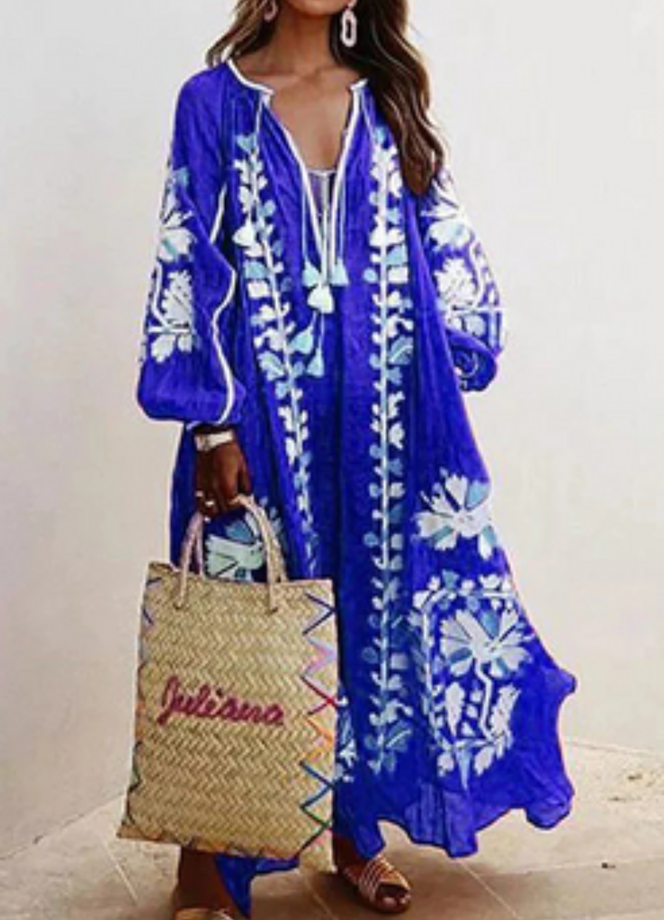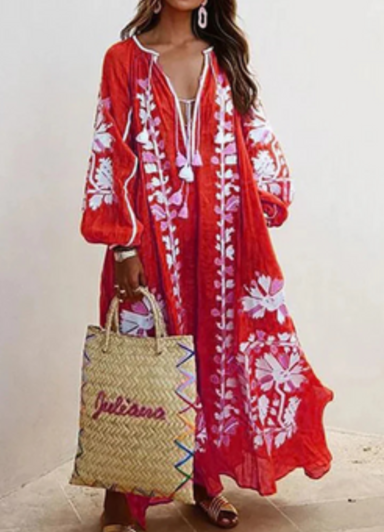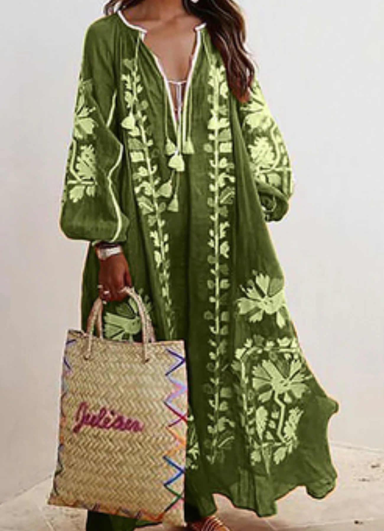 Cette robe longue pour femme incarne l'élégance bohème avec son imprimé floral et ses détails minimaux. Parfaite pour une journée décontractée ou une escapade à la plage, sa coupe ample offre une silhouette fluide et légère. Les manches bouffantes et l'encolure en V ajoutent une touche romantique et féminine à ce look estival.
