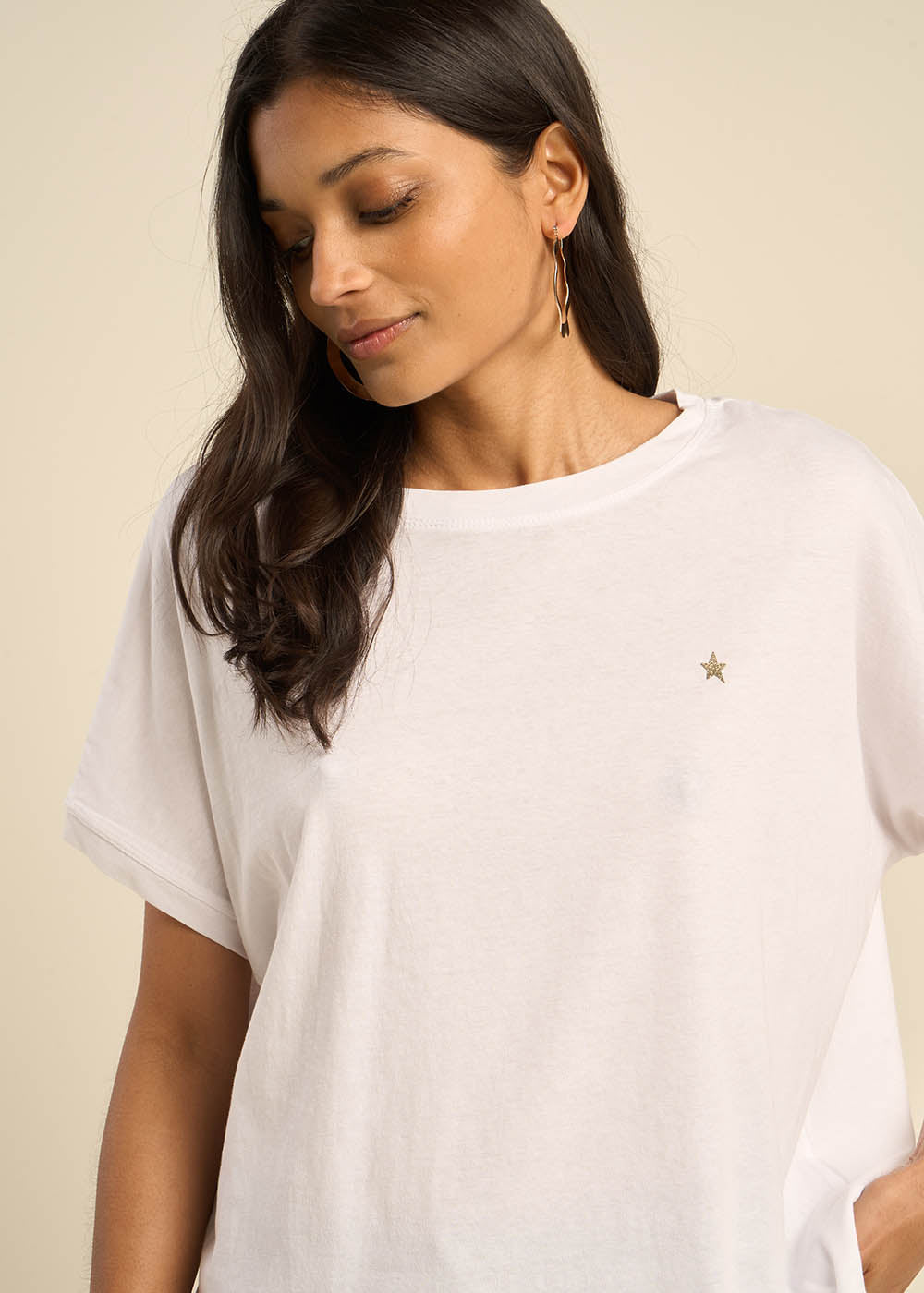 On a toutes besoin d'un tee-shirt à la coupe large pour se sentir bien dans ses vêtements! Le TRICIA coche toutes les cases : manches courtes col rond et 100% coton. Sa petite étoile sur la poitrine le rend unique.