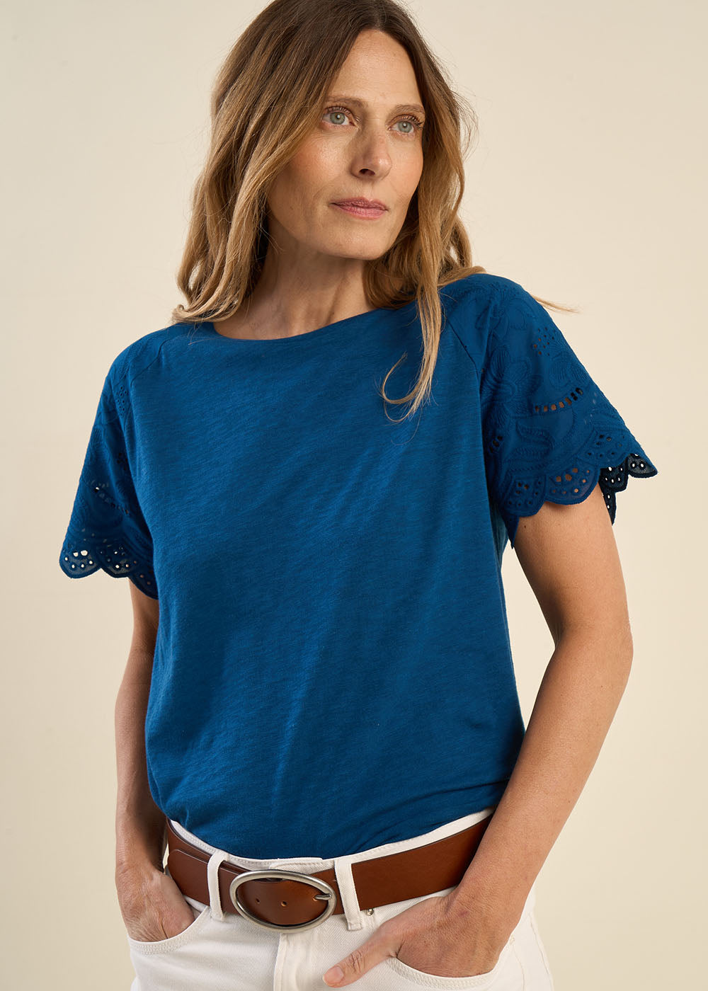 Le t-shirt TIANI incarne la délicatesse et la modernité avec ses manches raglan sublimées par de fines broderies anglaises. Confectionné dans une matière slub, il offre une texture subtile et un confort absolu. Une pièce féminine et facile à porter au quotidien.