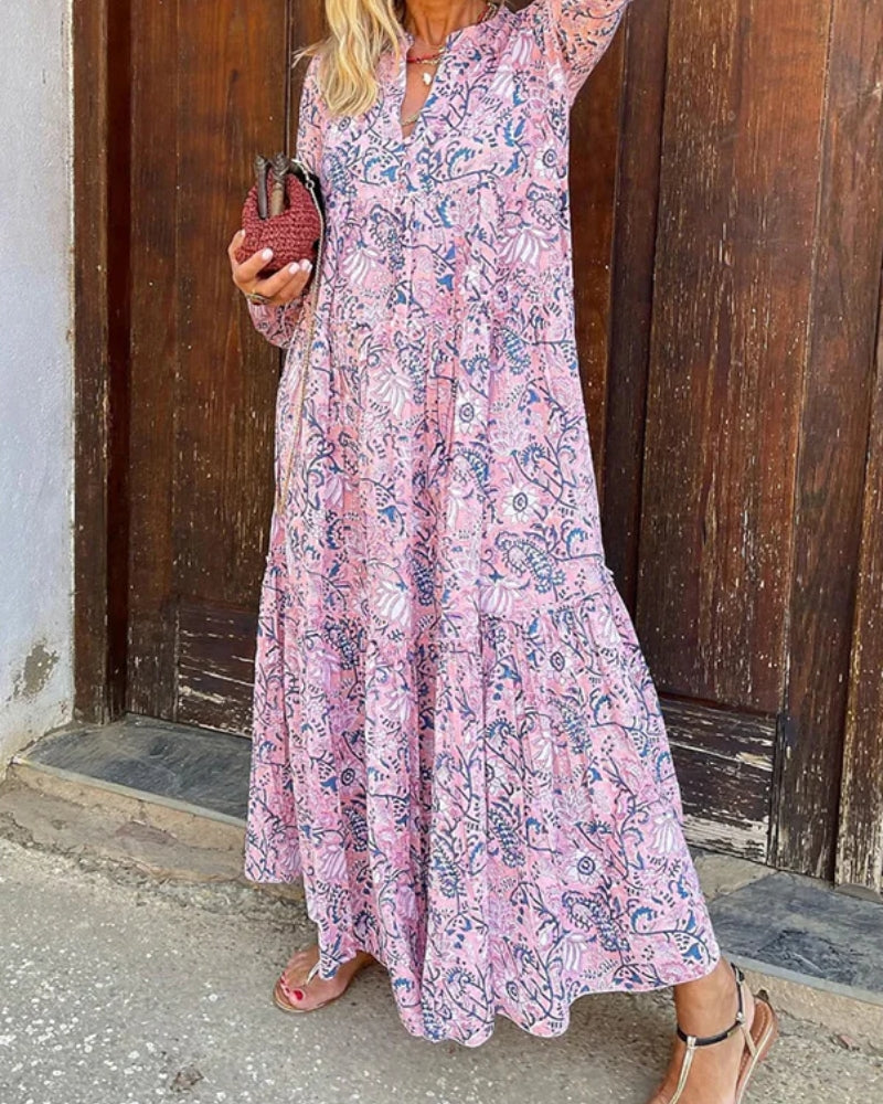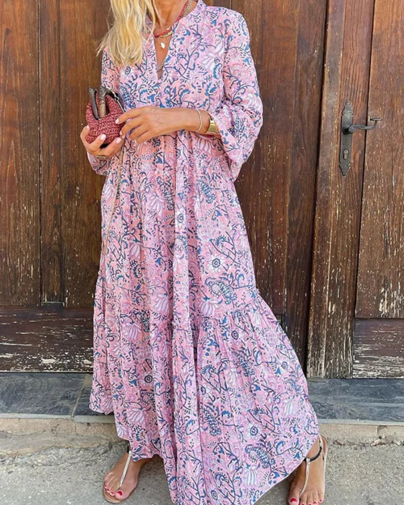 Cette robe maxi présente un décolleté en V flatteur, des manches longues confortables avec des poignets élastiqués, et une jupe magnifiquement superposée qui ajoute un mouvement gracieux.