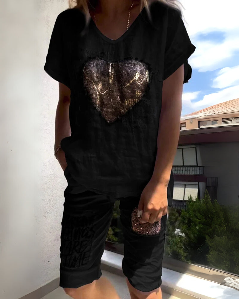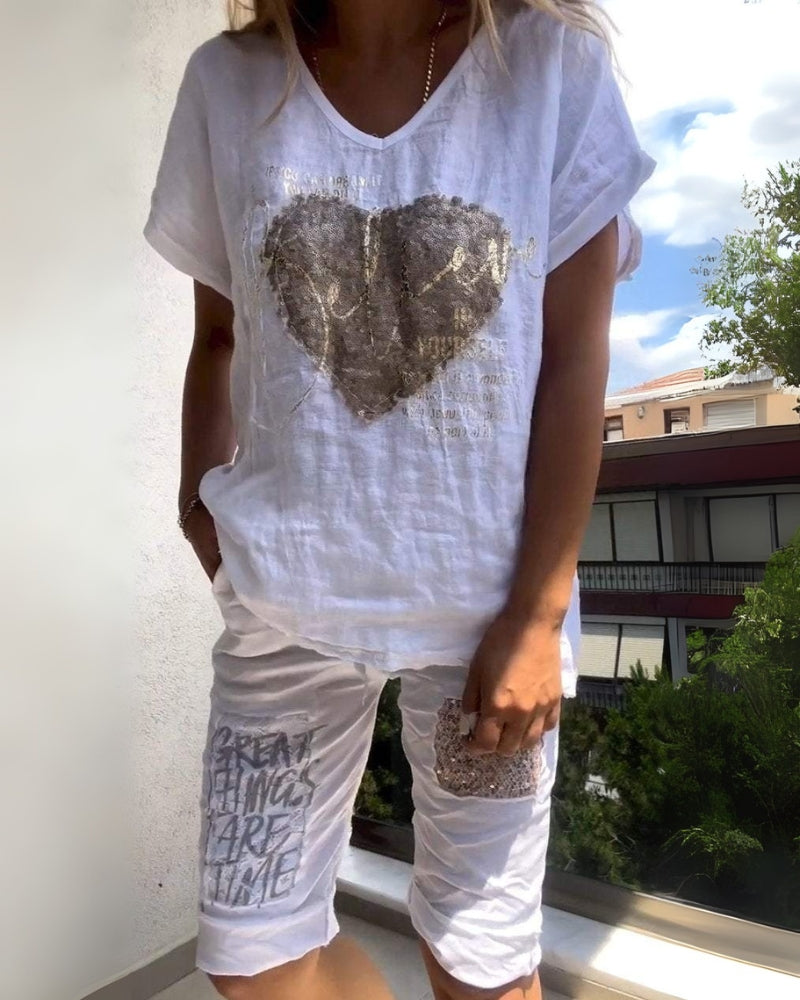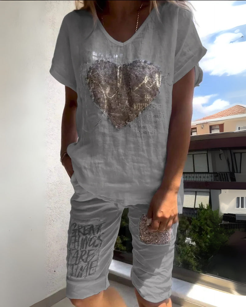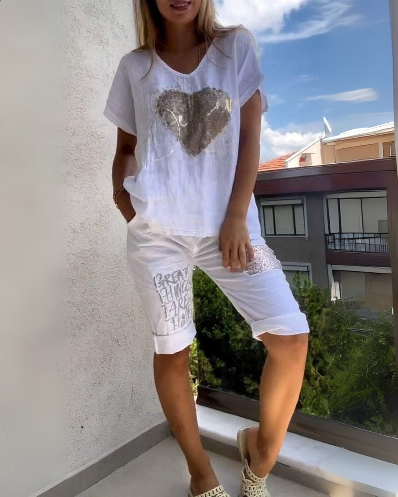 Composé d’un t-shirt graphique à coupe ample avec un motif cœur scintillant et d’un short à cordon assorti décoré de phrases inspirantes, cet ensemble est parfait pour se détendre, se promener ou prendre un café en toute simplicité.