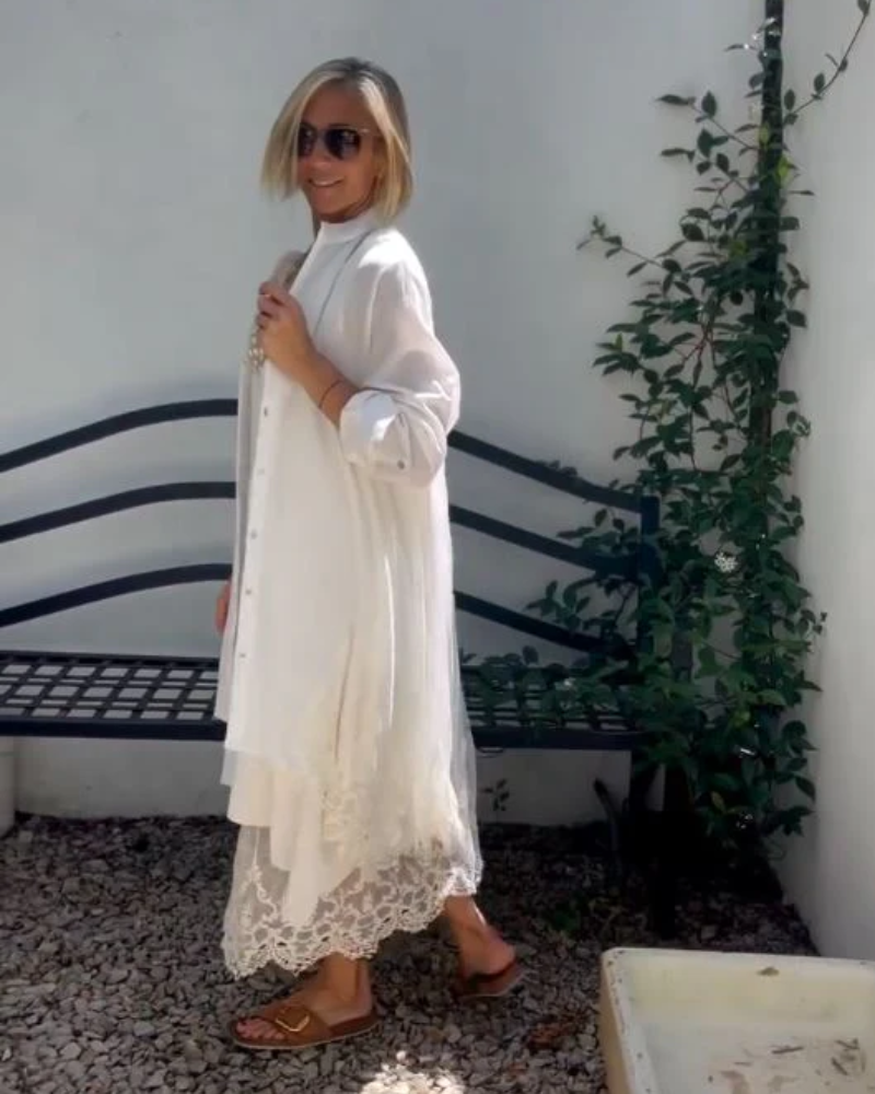 Ce set comprend une chemise blanche boutonnée oversize, impeccable, qui peut être portée ouverte comme une veste légère ou fermée comme une robe.