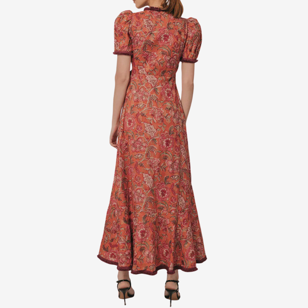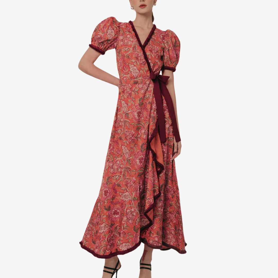 Adoptez une élégance naturelle avec Avelia™, une robe longue magnifiquement conçue qui allie charme vintage et modernité. Cette pièce sublime présente de délicates manches bouffantes, un décolleté en V profond et une jupe fluide et gracieuse à l'ourlet asymétrique. Son imprimé floral romantique aux tons corail et mauve chaleureux est souligné par des finitions contrastées le long de l'encolure, de la taille et des poignets. Idéale pour une promenade au café, une garden-party ou un événement élégant en journée.