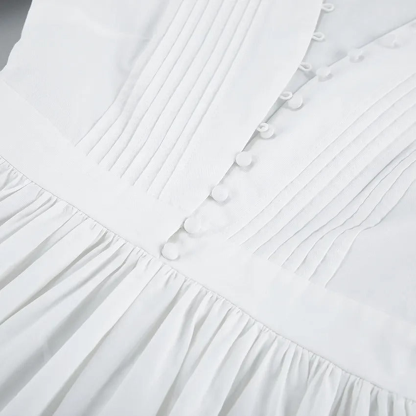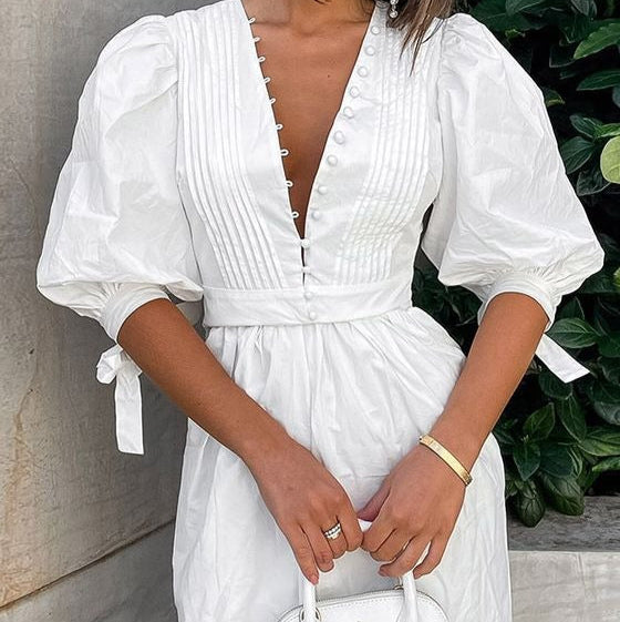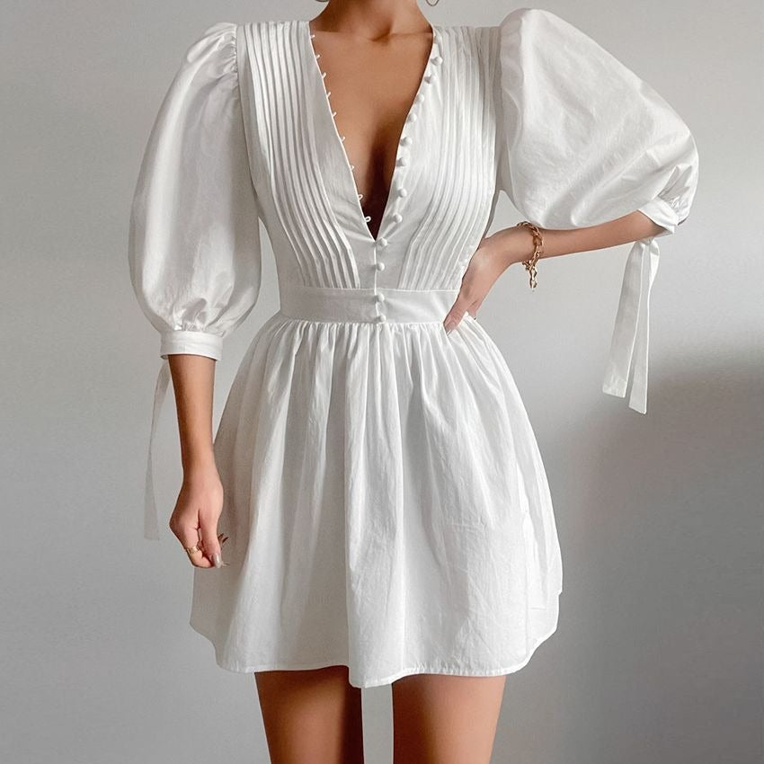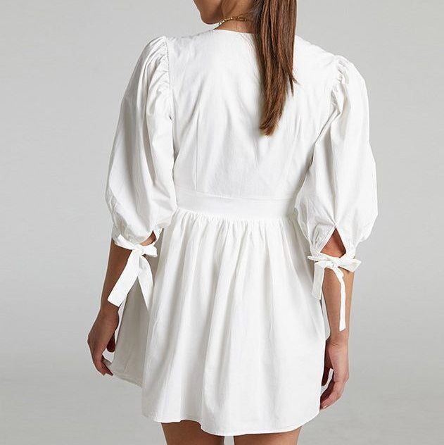 Sentez la légèreté de l'été à chaque pas dans cette robe courte d'inspiration romantique. Le décolleté en V, les manches bouffantes avec nœud et les boutons décoratifs sur le devant créent une silhouette féminine et raffinée qui ne passera pas inaperçue.