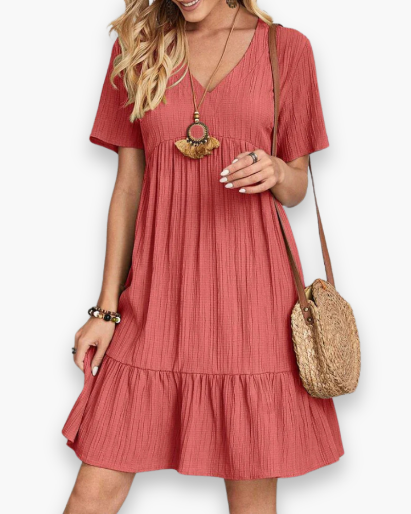Légère, fluide et pleine de charme, cette robe d'été mini est votre alliée parfaite pour les journées ensoleillées. Son col en V flatteur et sa coupe décontractée en font une pièce aussi confortable que stylée, idéale pour flâner à la plage ou profiter d'une terrasse en ville.