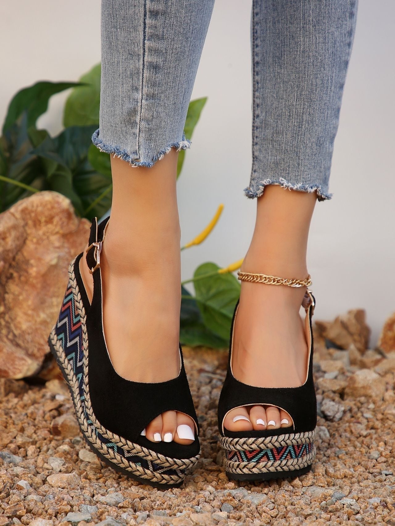 Conçues pour rehausser votre style grâce à un savoir-faire contemporain, ces sandales compensées pour femmes offrent un mélange parfait de confort et de caractère visuel. Le talon compensé doublé d'un tissu ethnique en zigzag ajoute de la hauteur et de l'éclat, tandis que les lanières en daim souple avec fermeture à boucle réglable offrent un soutien sûr et une finition sophistiquée.