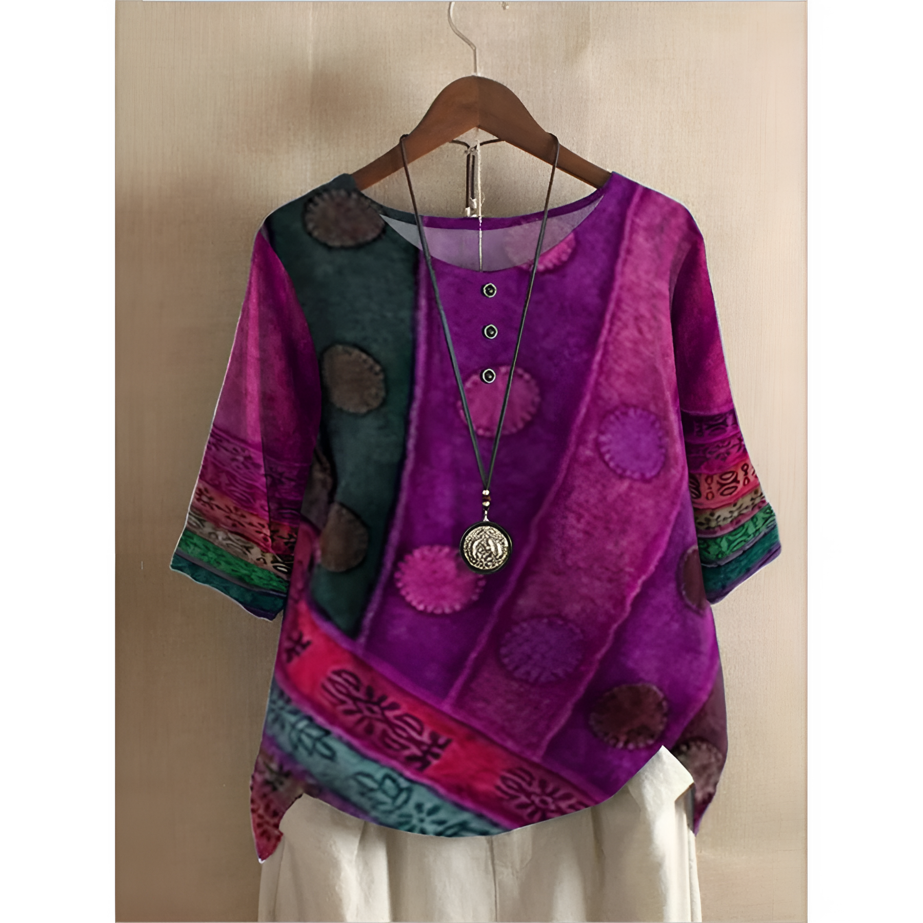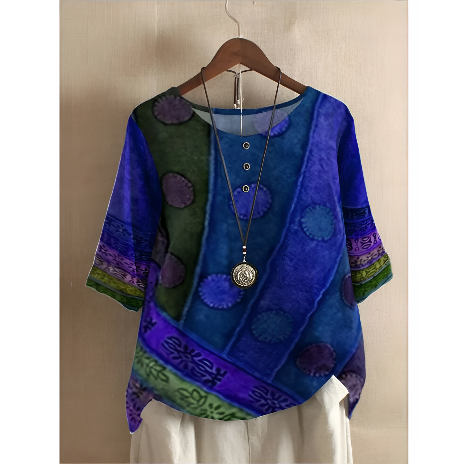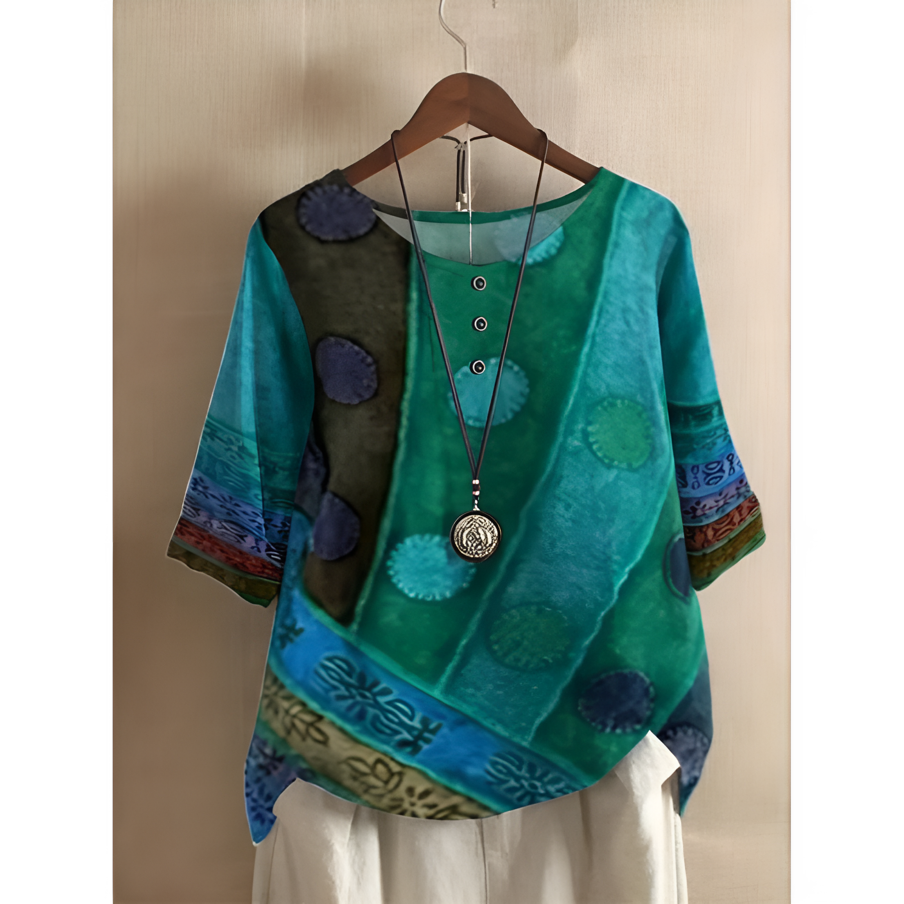 Tombez amoureux du haut Valarie — une pièce respirante et légère qui offre un confort tout au long de la journée et un style sans effort. Son design artistique en patchwork ajoute une touche unique et bohème à n'importe quelle tenue. Avec une coupe flatteuse pour tous les types de corps et des détails charmants comme des boutons décoratifs et des manches courtes, il est aussi polyvalent que beau. De plus, il est résistant aux plis et facile à entretenir — parfait pour un usage quotidien ou les voyages !