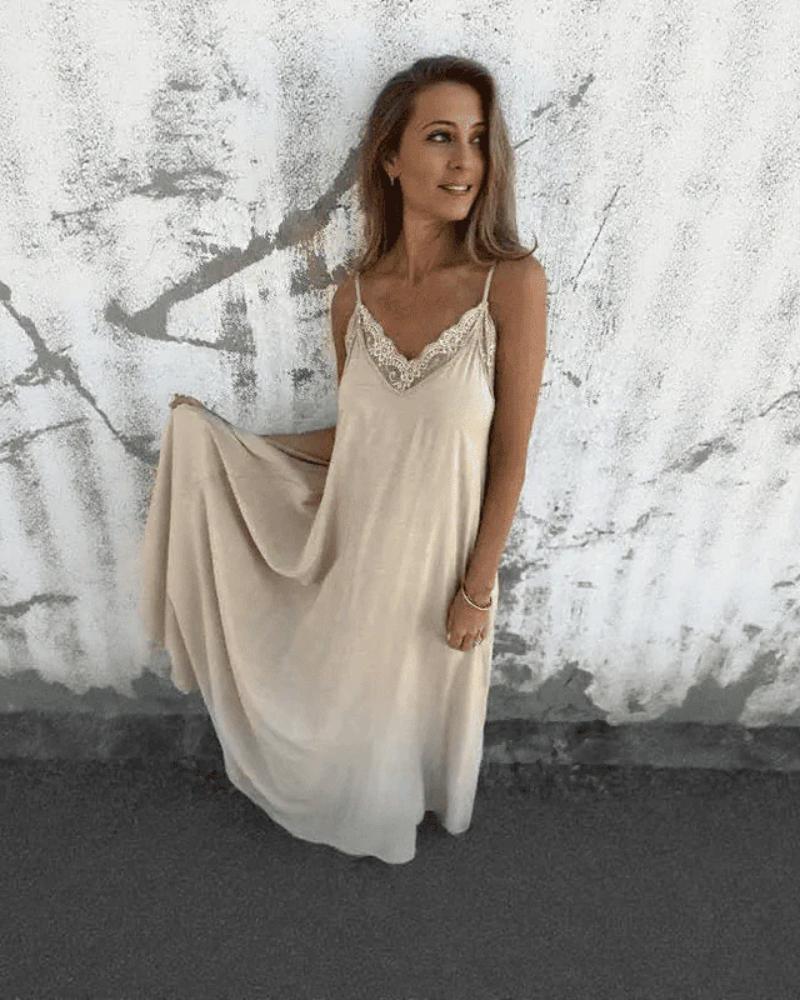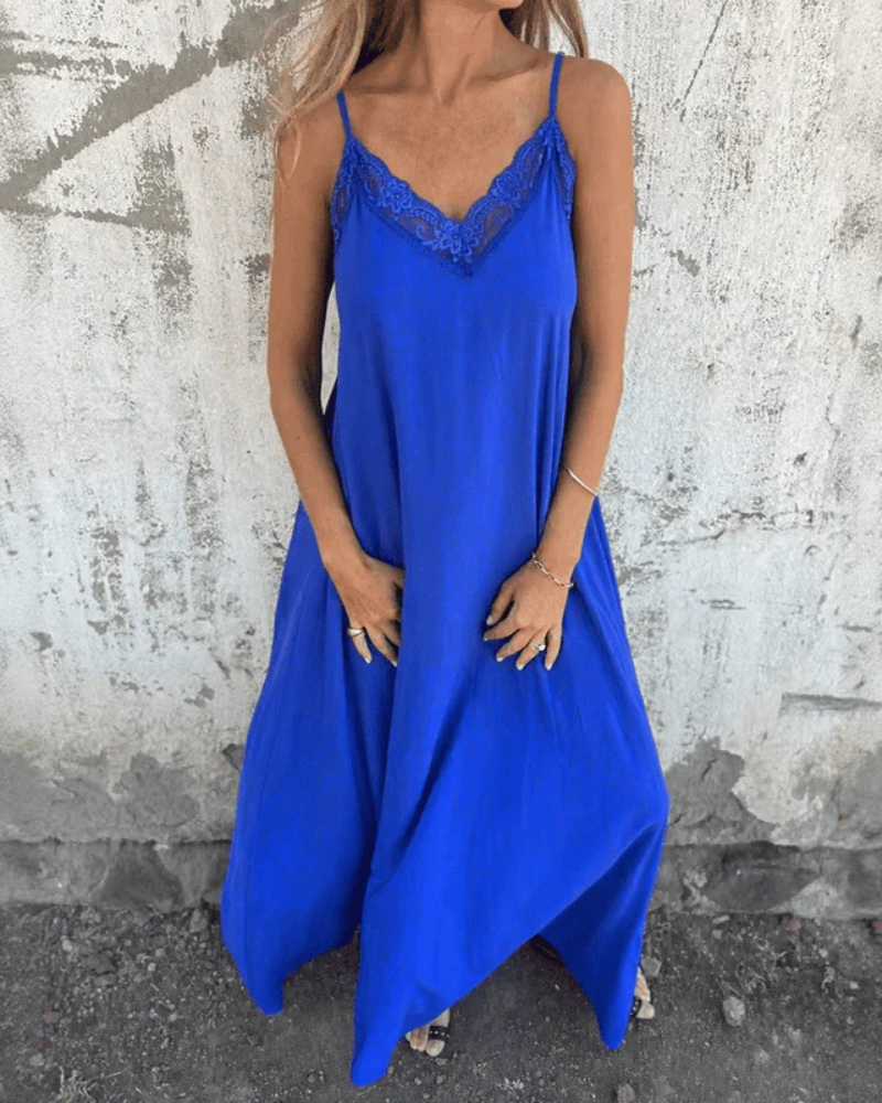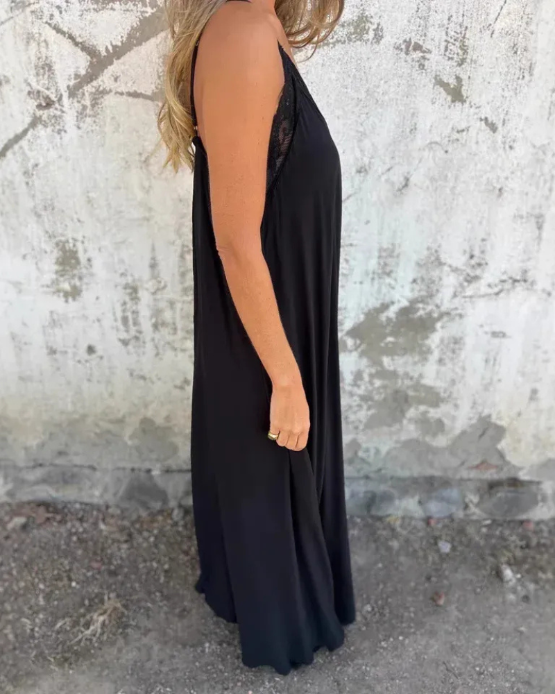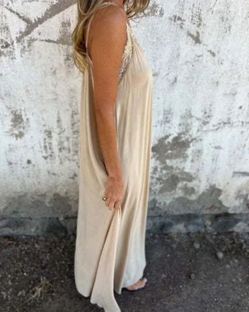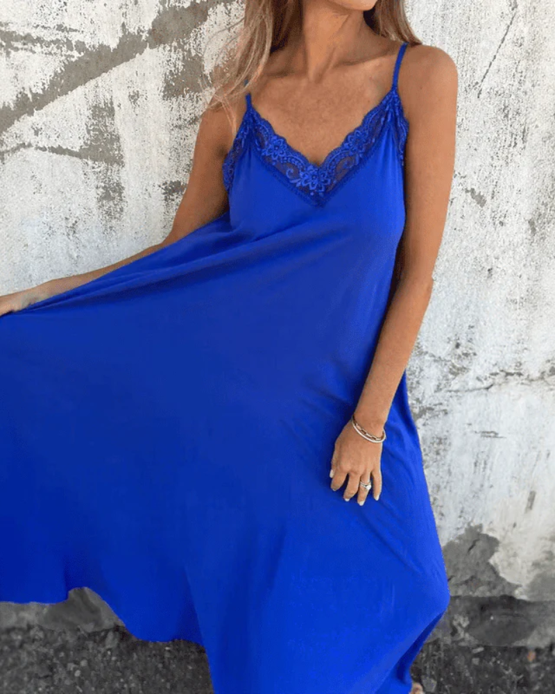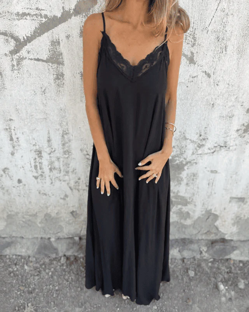 Une pièce charmante et polyvalente, parfaite pour ajouter une touche de romance et de sophistication à votre garde-robe. Cette robe maxi longueur présente un décolleté en V délicatement orné de dentelle et des bretelles spaghetti ajustables, créant une silhouette belle et confortable. Conçue à partir de matériaux légers et respirants, elle est idéale pour les vacances à la plage, les sorties décontractées ou toute occasion où vous souhaitez vous sentir élégante sans effort.